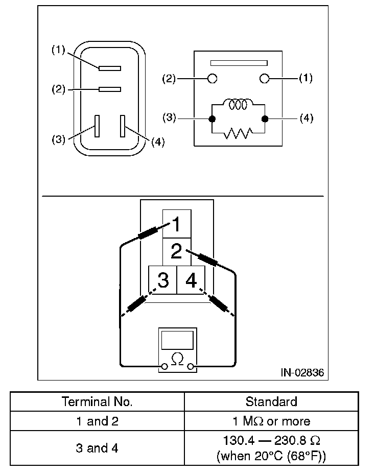 3. Connect terminal No. 3 to battery positive terminal and terminal No. 4 to the battery ground terminal, and check the resistance between the main relay terminals.