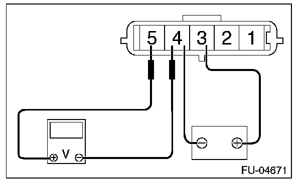 1. Connect battery positive terminal to terminal No. 3 and battery ground terminal to terminal No. 4, circuit tester positive terminal to terminal No. 5 and the circuit tester negative terminal to terminal No. 4.