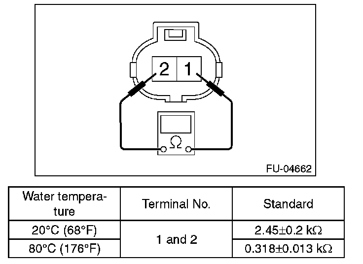 3. Raise water temperature gradually, measure the resistance between the engine coolant temperature sensor terminals when the temperature is 20 °C (68 °F) and 80 °C (176 °F).