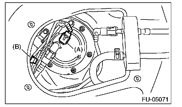 6. Disconnect the connector (A) from fuel sub level sensor, and remove the clip (B) securing the fuel cord from fuel sub level sensor protector.