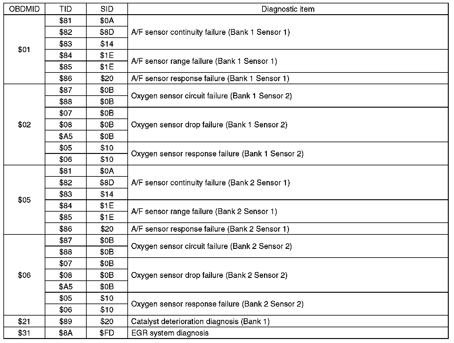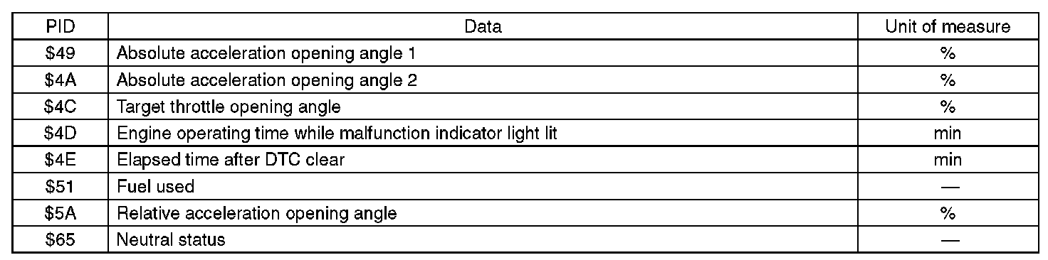 A list of the support data and PID (Parameter Identification) codes are shown in the following table.