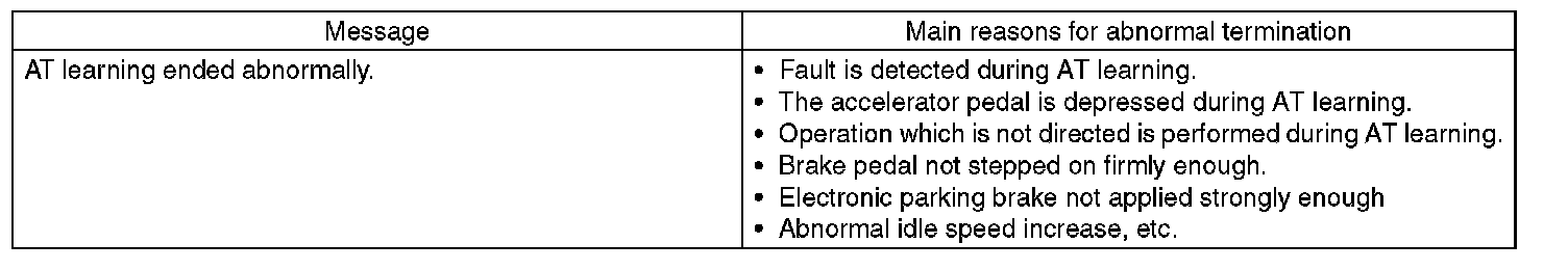 During "SHIFT control system learning in progress" and "AWD control system learning in progress", AT OIL TEMP light in the combination meter starts blinking at 2 Hz and the learning operation starts. The following message is displayed on the screen when the AT OIL TEMP light in the combination meter goes off. When the learning ended abnormally, AT OIL TEMP light blinks at 4 Hz.