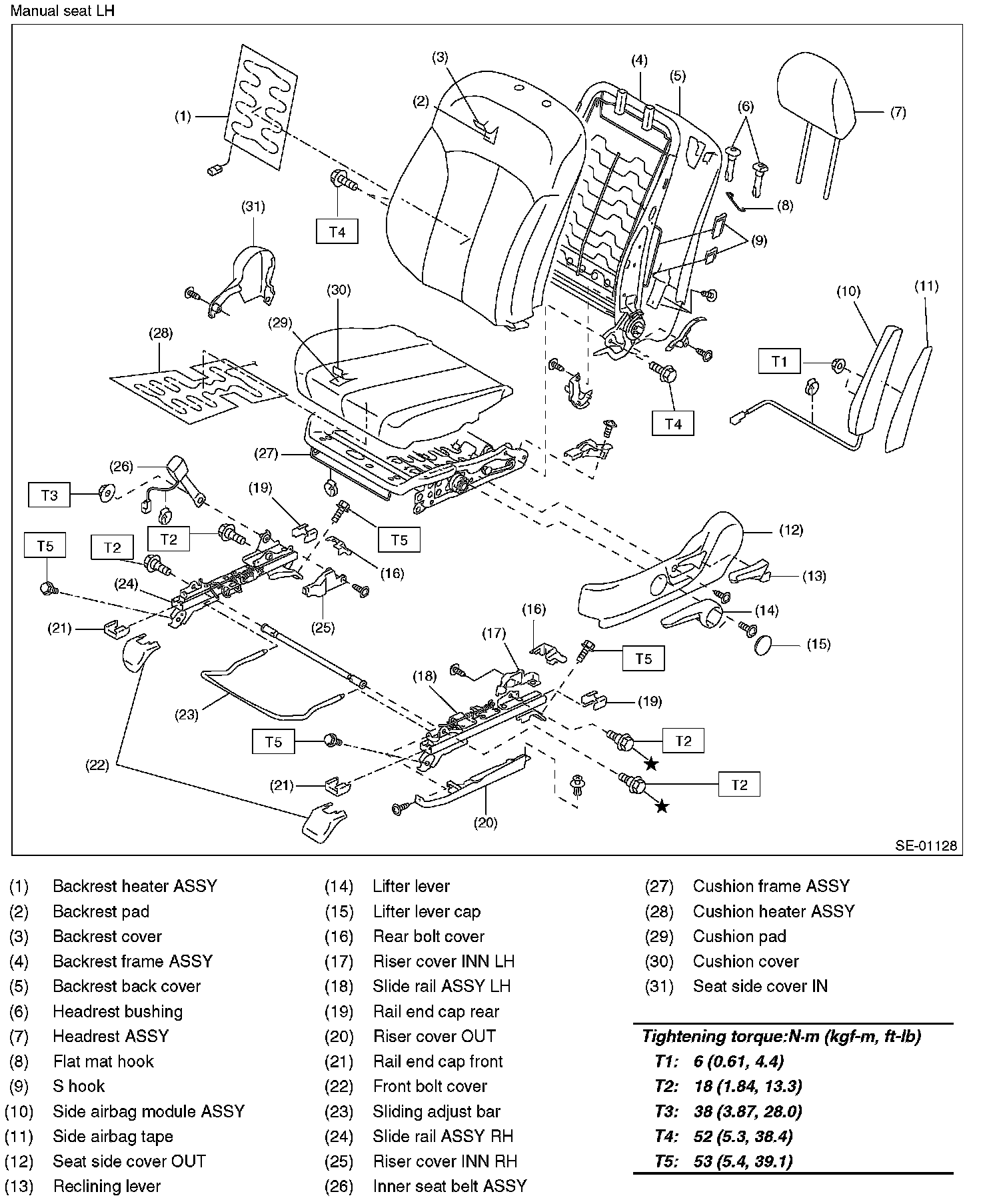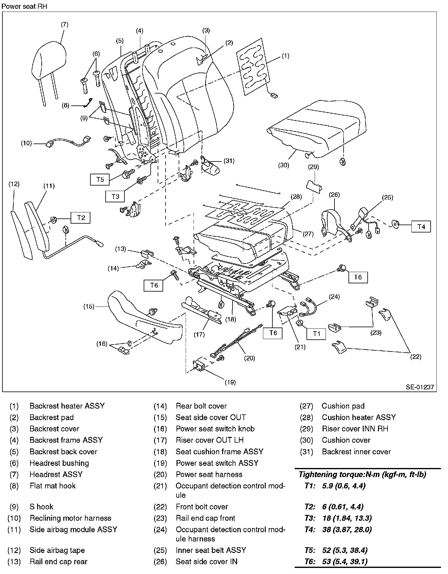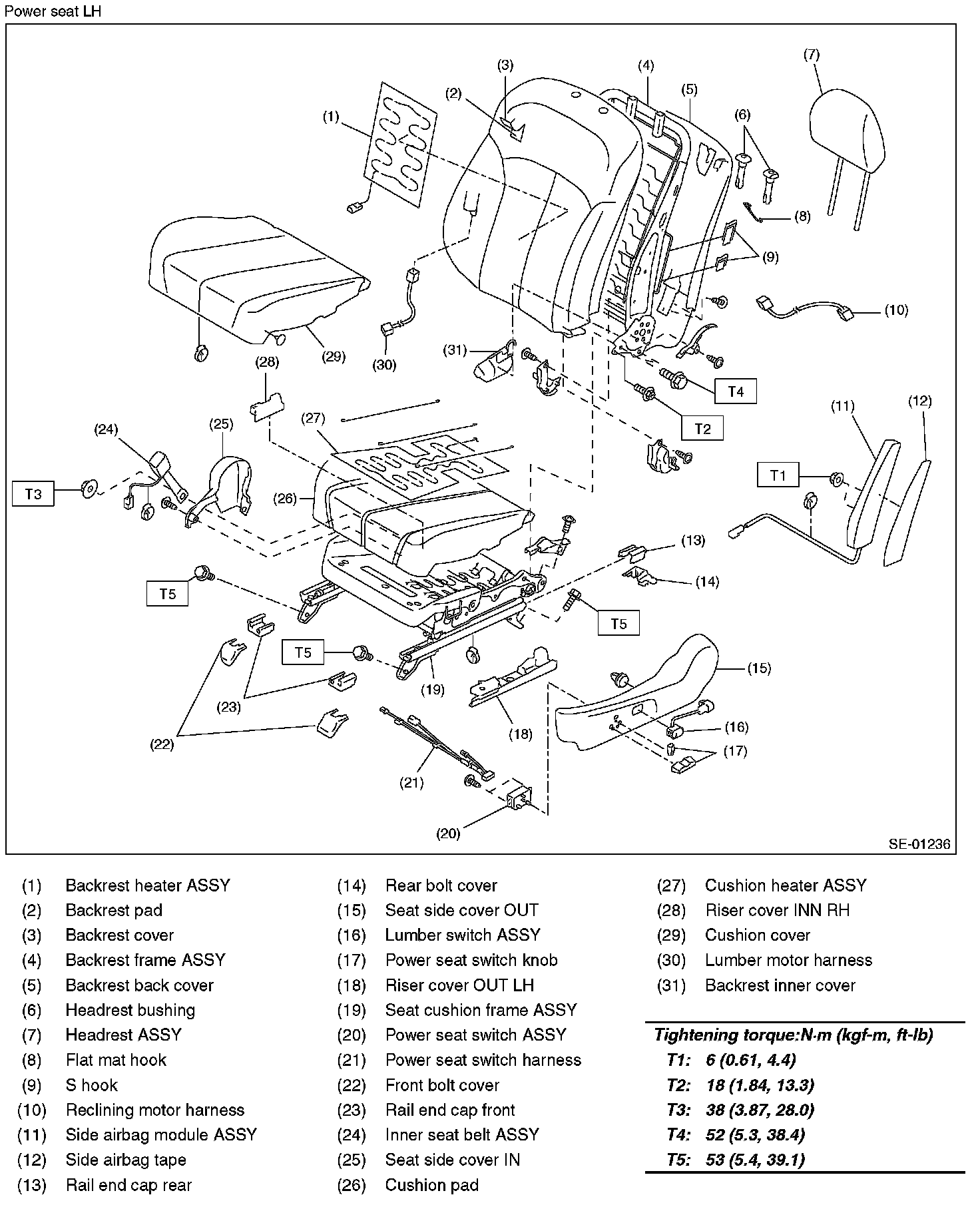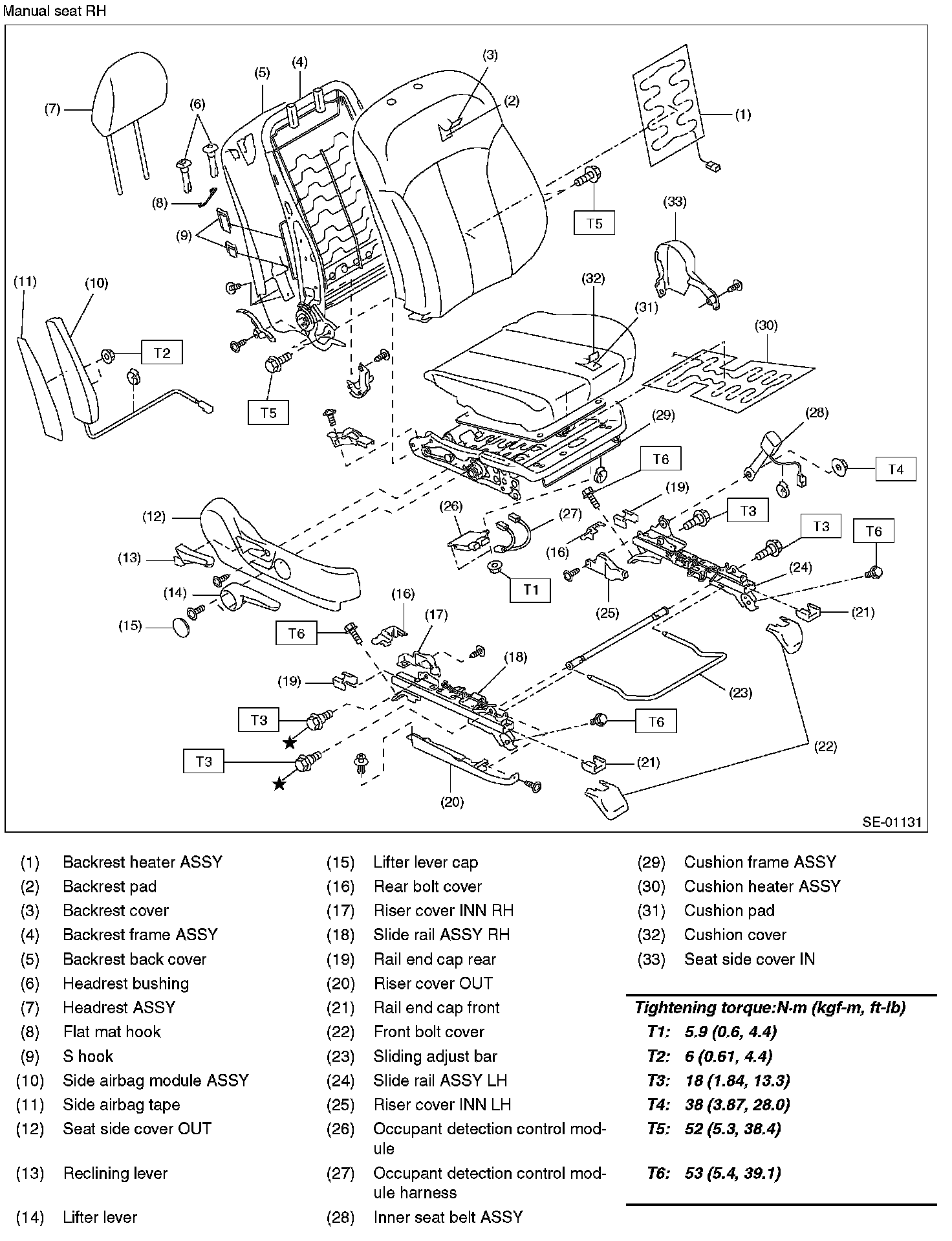 Tightening torque: Front seat assembly: 53 N.m (5.4 kgf-m, 39.1 ft-lb)