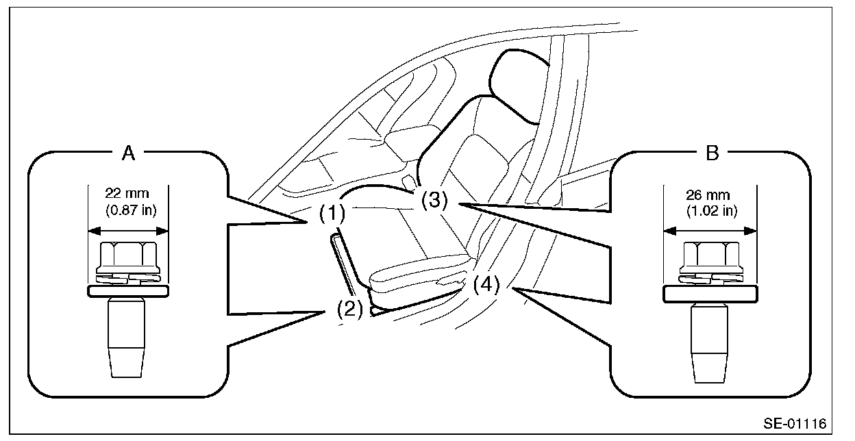 - Rear (bolt B): Washer diameter 26 mm (1.02 in)