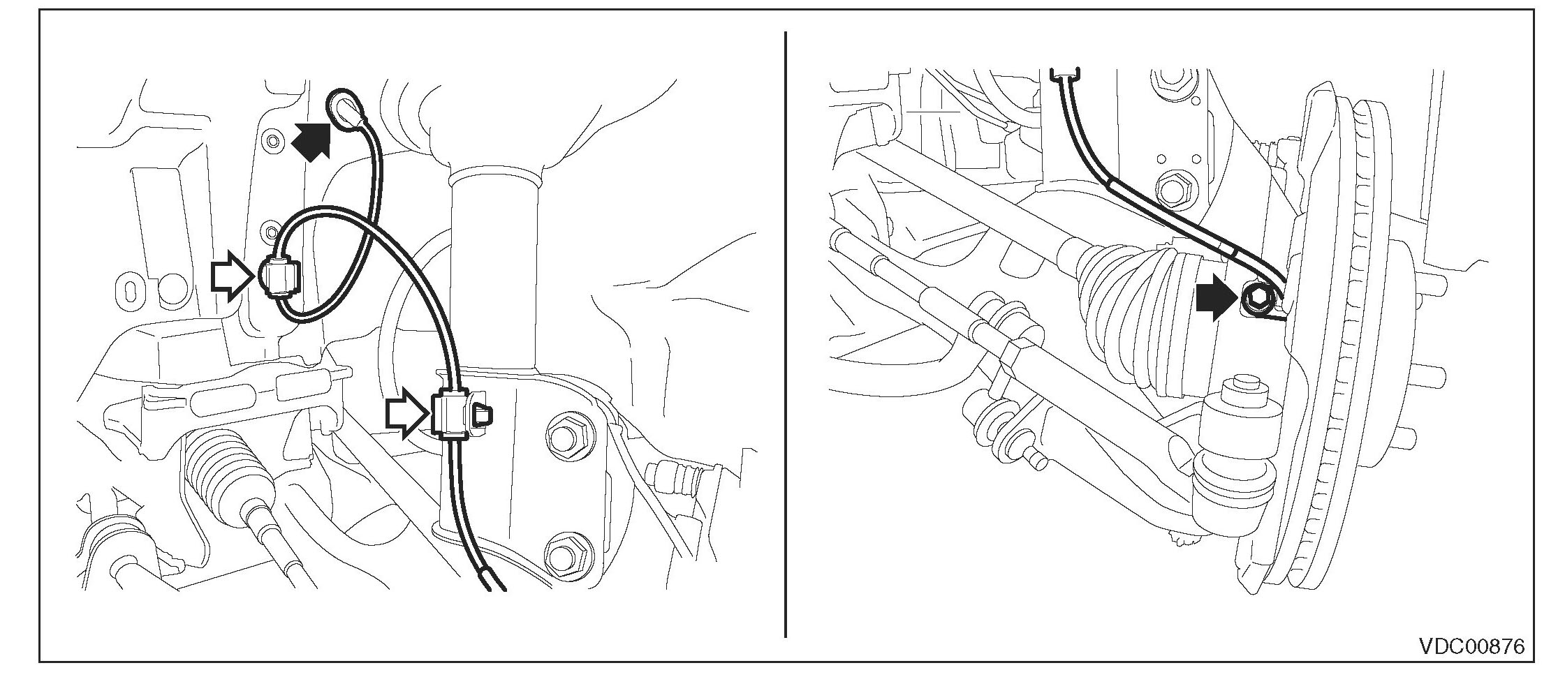 3) Check the ABS wheel speed sensor cable for discontinuity. If defective, replace the ABS wheel speed sensor.