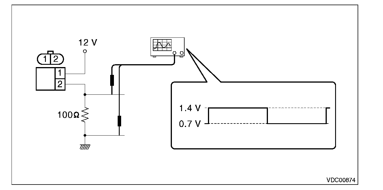 4) Connect a 12 V power supply to No. 1 terminal of ABS wheel speed sensor connector, then attach resistance to the No. 2 terminal. Rotate the wheel at about 2.75 km/h (2 MPH), and measure the voltage using an oscilloscope.