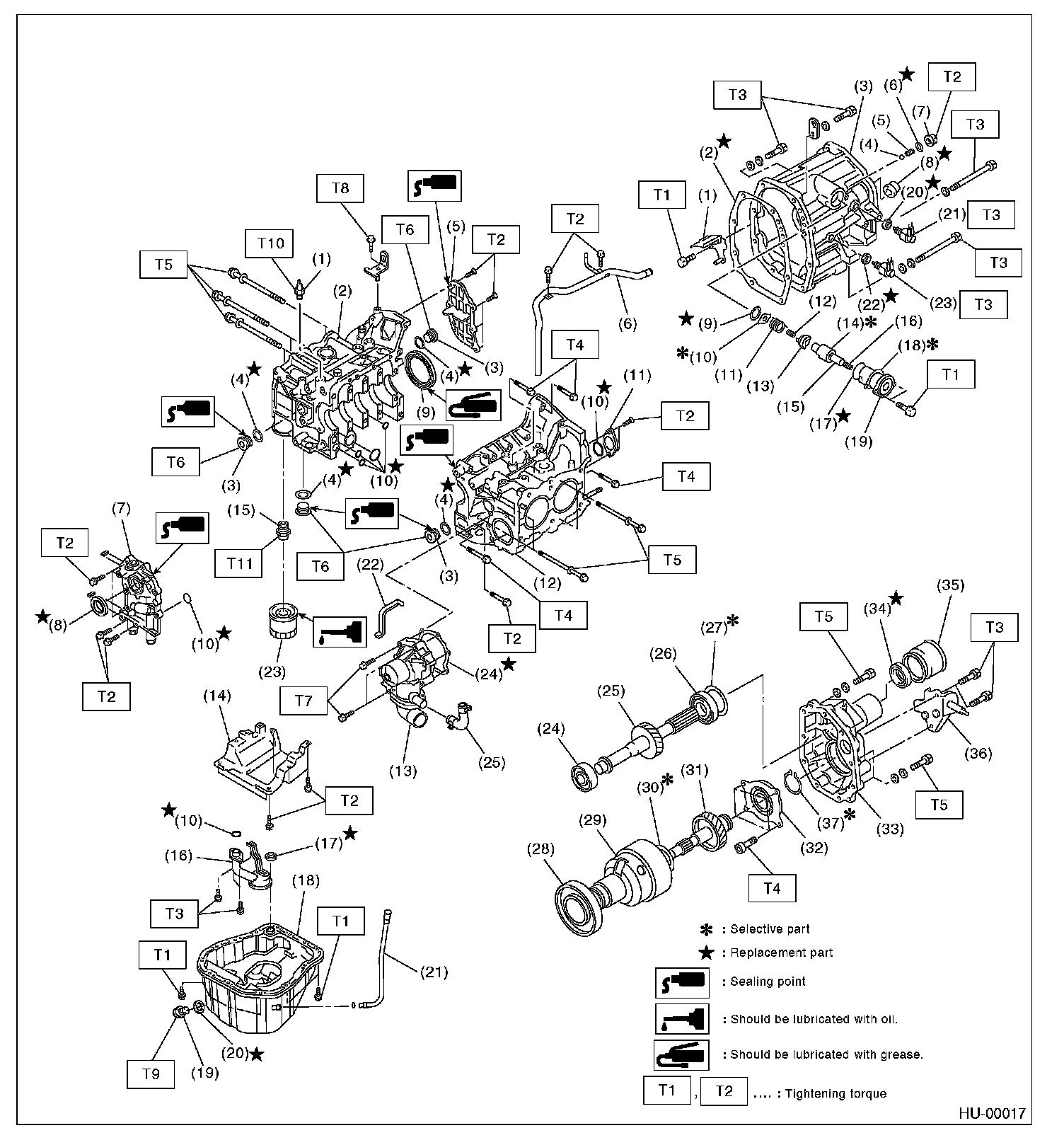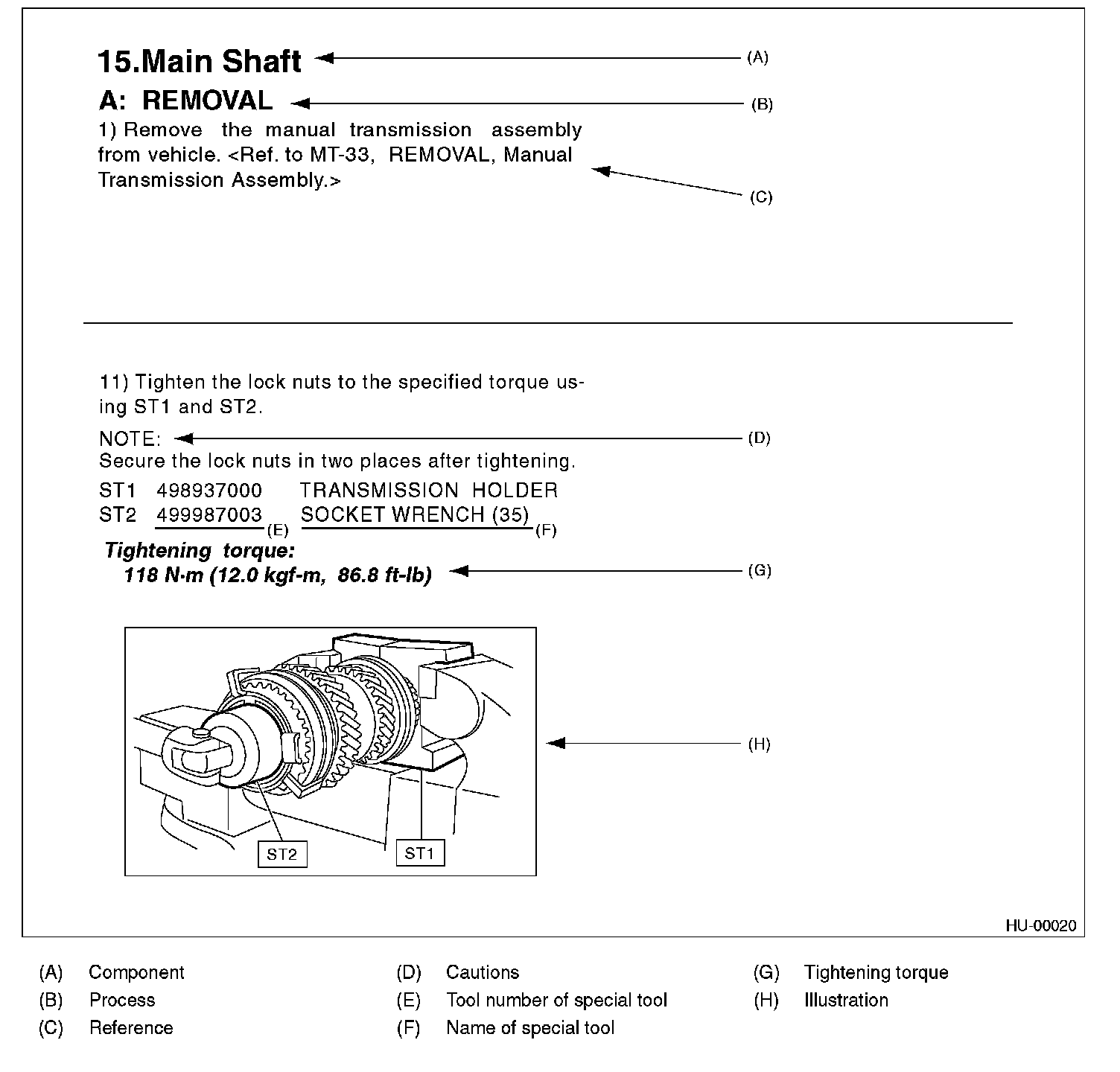 Illustrations are provided for each component. The information necessary for repair work (tightening torque, grease up points, etc.) is described on these illustrations. Information is described using symbol.
