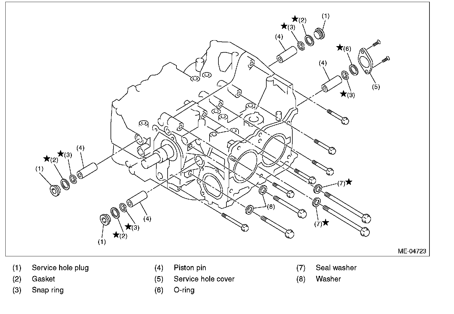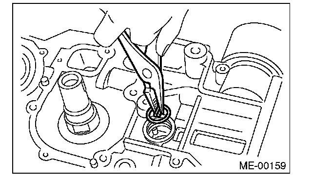 24) Rotate the crankshaft to bring #1 and #2 pistons to bottom dead center position, then remove the piston snap ring through service hole of #1 and #2 cylinders.