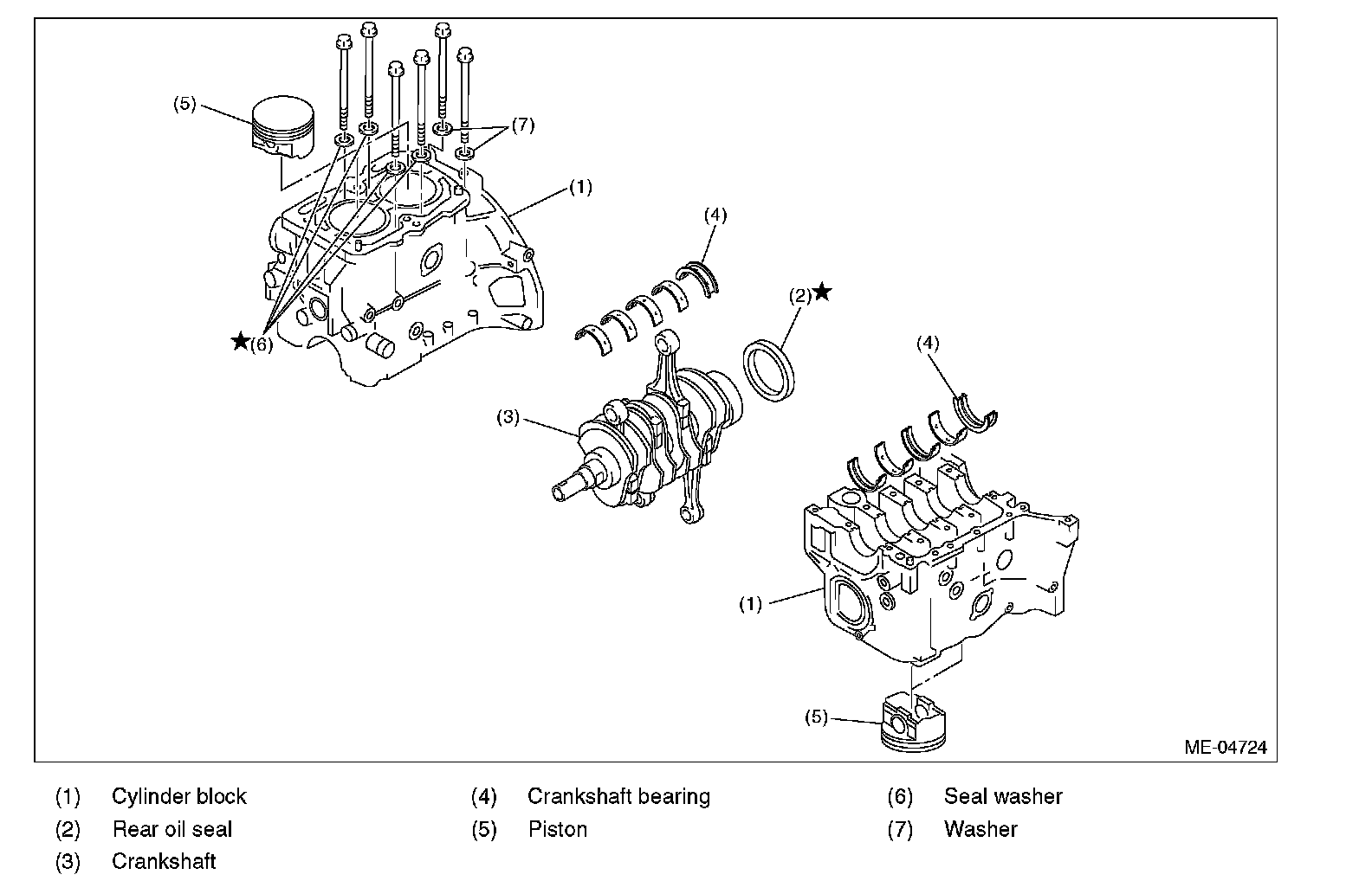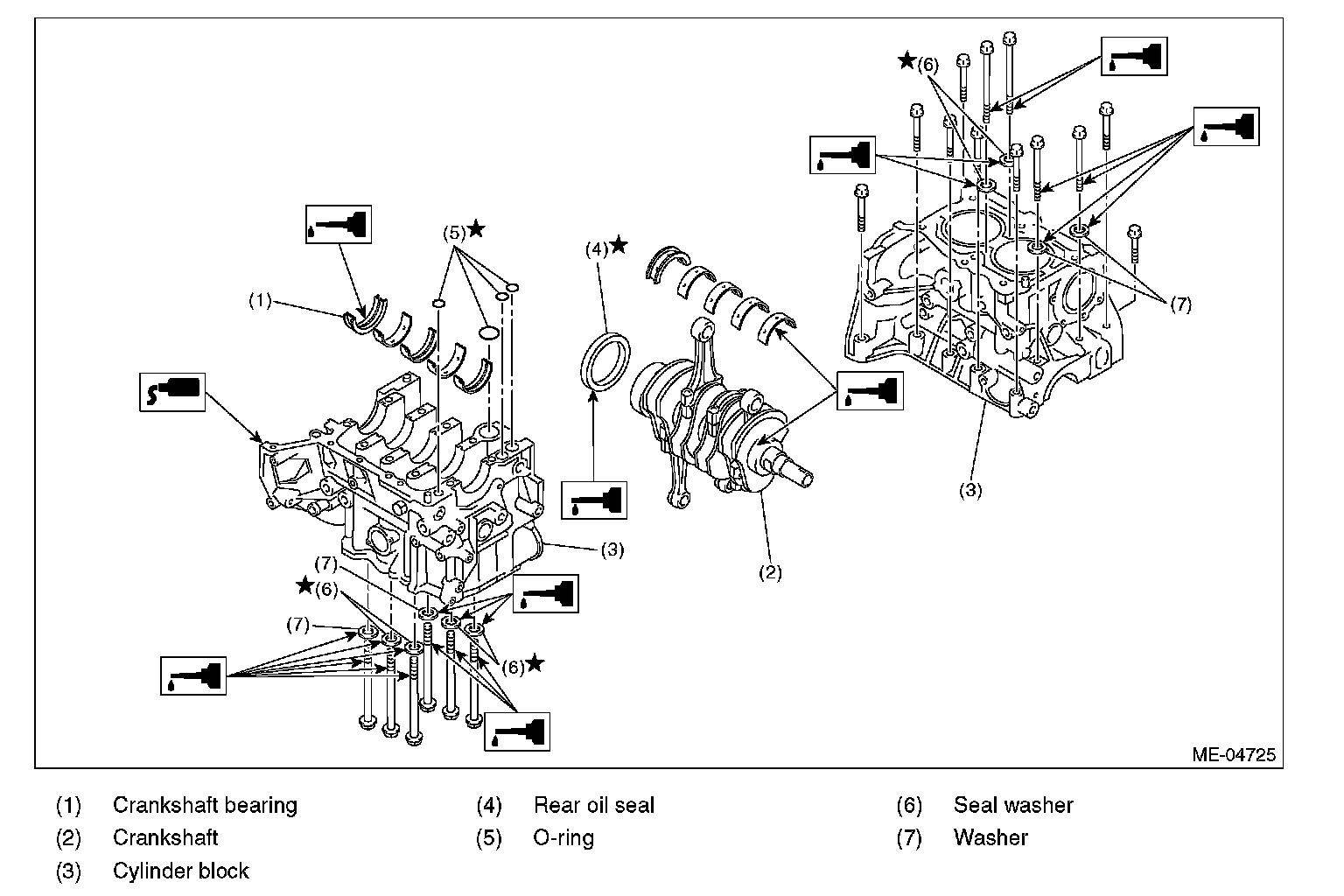 1) Remove oil on the mating surface of cylinder block before installation. Apply a coat of engine oil to the bearing and crankshaft journal.