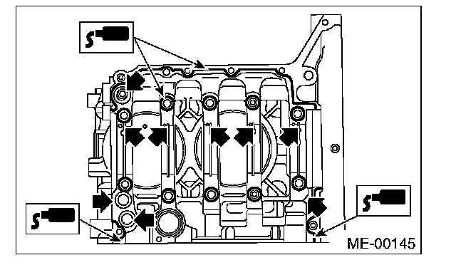24) Apply liquid gasket to the mating surfaces of cylinder block lower, and install the cylinder block lower.