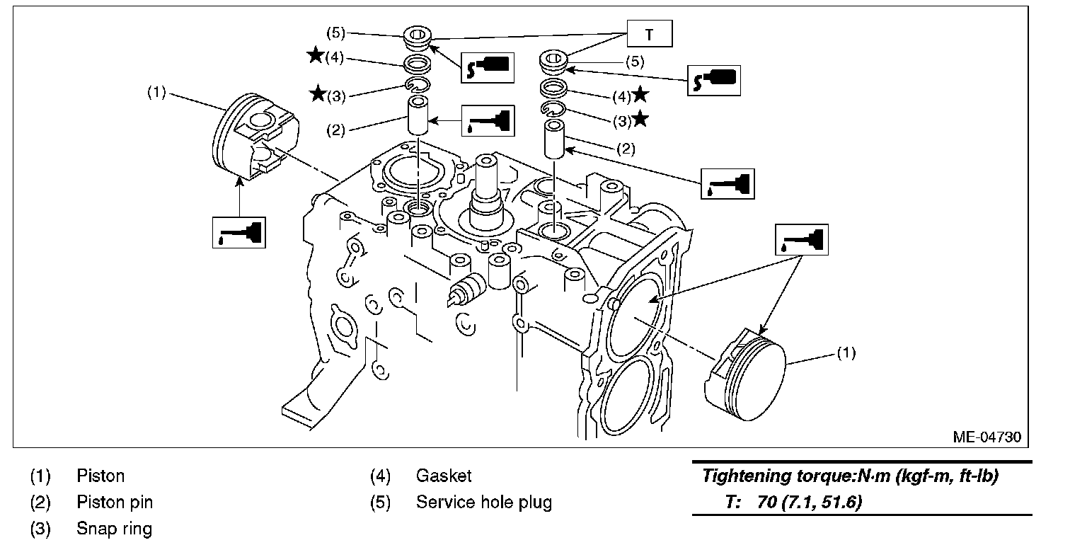 (3) Apply a coat of engine oil to piston pin, and insert the piston pin into piston and connecting rod through service hole.