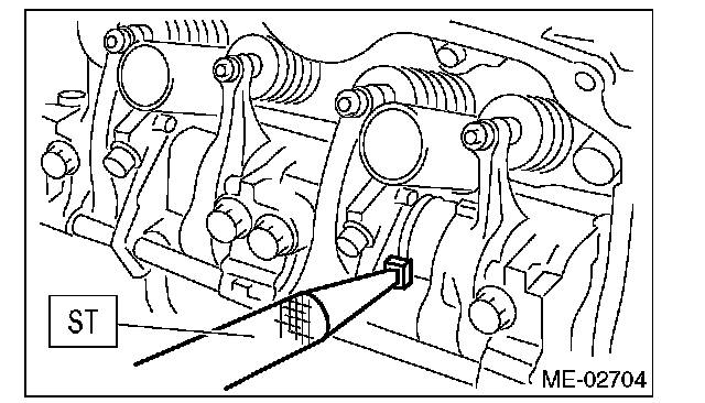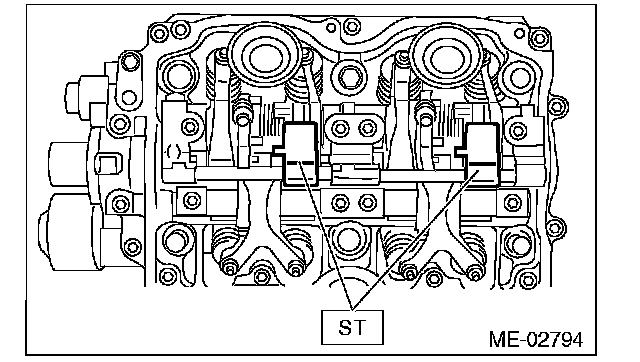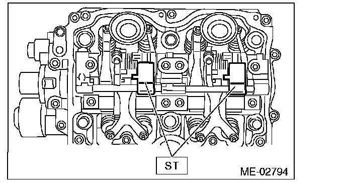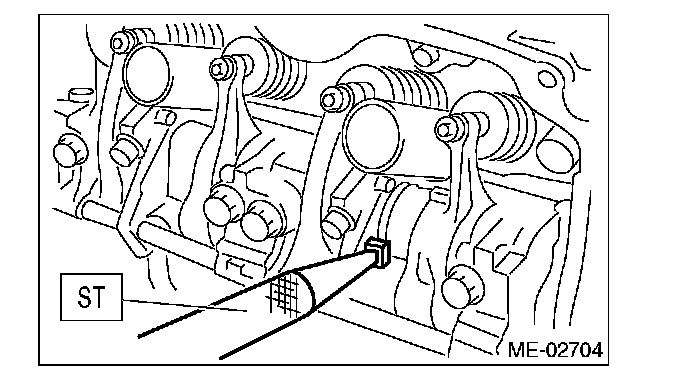 ^ Set the ST in the position shown in the drawing to mount the intake valve rocker assembly.