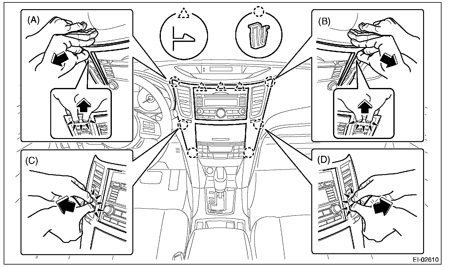 3. Insert a finger into the air vent grille and release the left and right clips at the center of the center panel. (C), (D)
