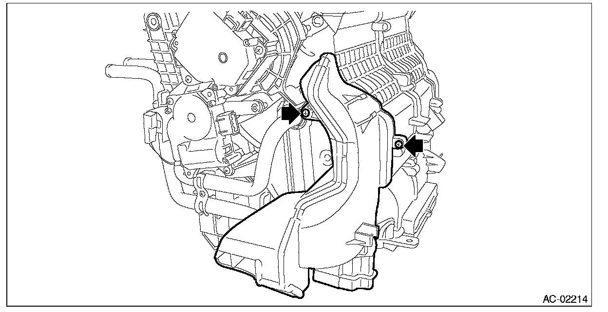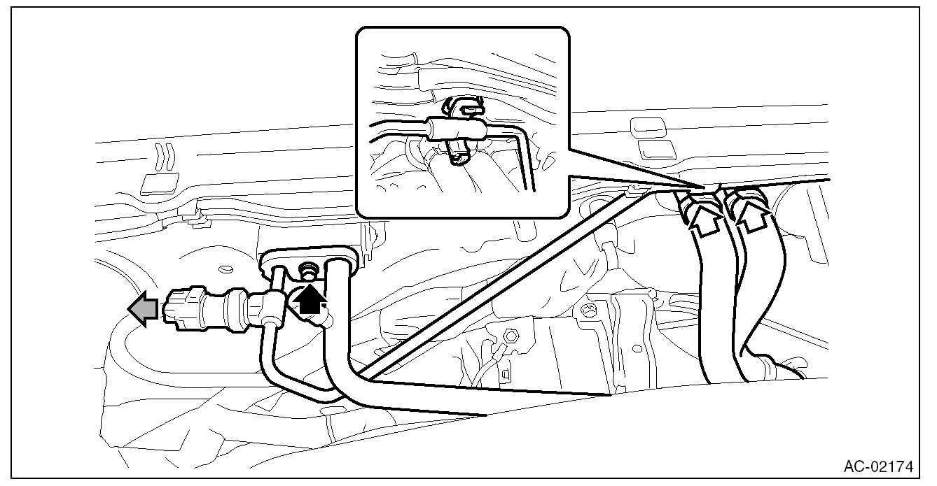 4. Remove the connector and bolts, and remove the expansion valve and AC pipes from the evaporator.