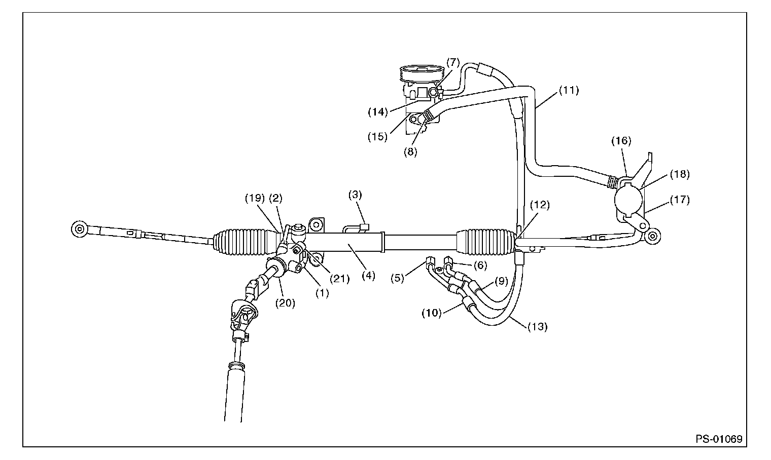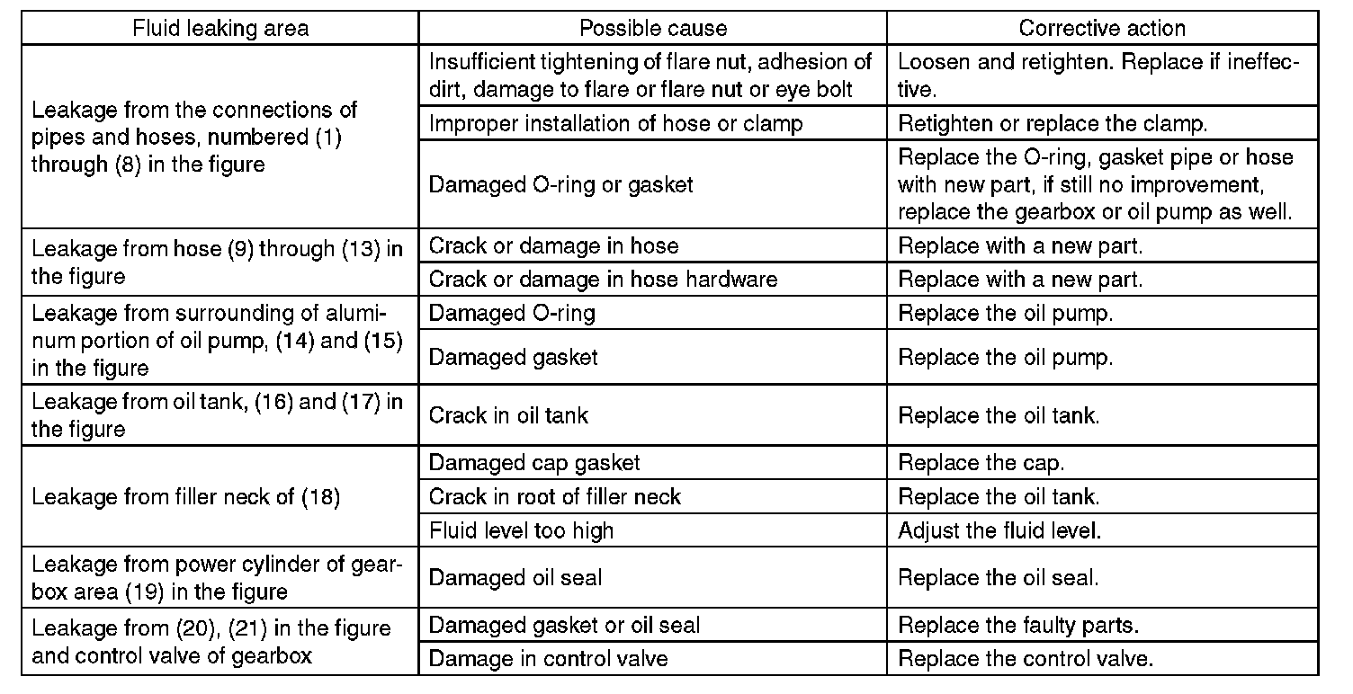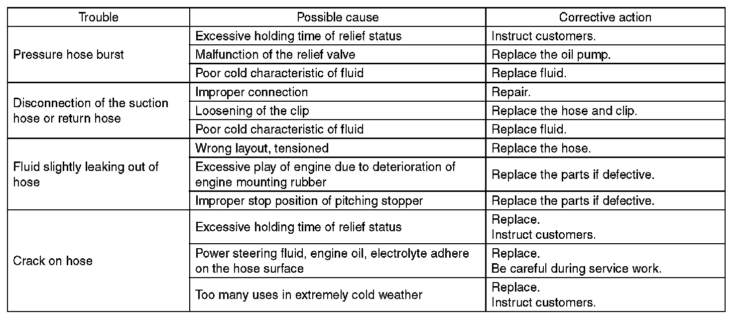 Although the surface layer materials of rubber hoses have excellent weathering resistance, heat resistance and resistance for low temperature brittleness, they are likely to be damaged chemically by brake fluid, battery electrolyte, engine oil and automatic transmission fluid and their service lives are to be very shortened. Wipe off hoses immediately if any of these come into contact with the hoses. Since resistances for heat or low temperature brittleness are gradually declining according to time accumulation of hot or cold conditions for the hoses and their service lives are shortening accordingly, it is necessary to perform careful inspection frequently when the vehicle is used in hot weather areas, cold weather areas and a driving condition in which many steering operations are required in short time.