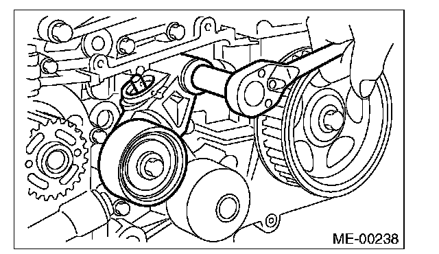 2) Check the belt tension pulley for smooth rotation. Replace the automatic belt tension adjuster assembly with a new part if abnormal noise or excessive play occurs.