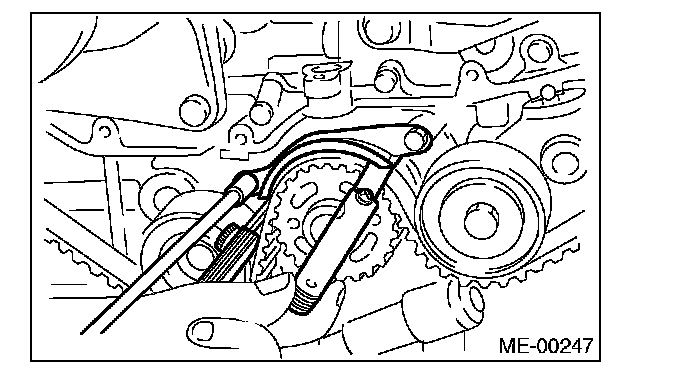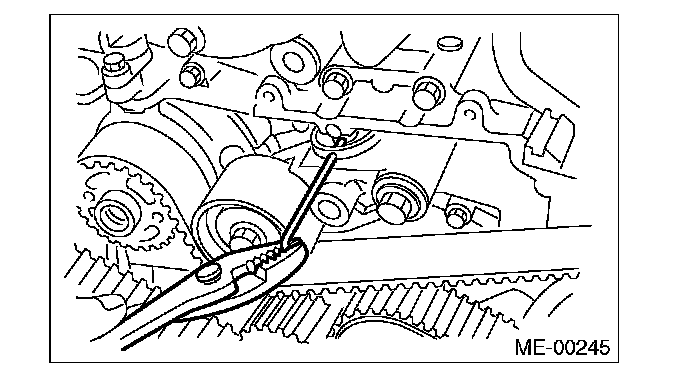 7) After ensuring the marks on timing belt and camshaft sprockets are aligned, remove the stopper pin from belt tension adjuster.