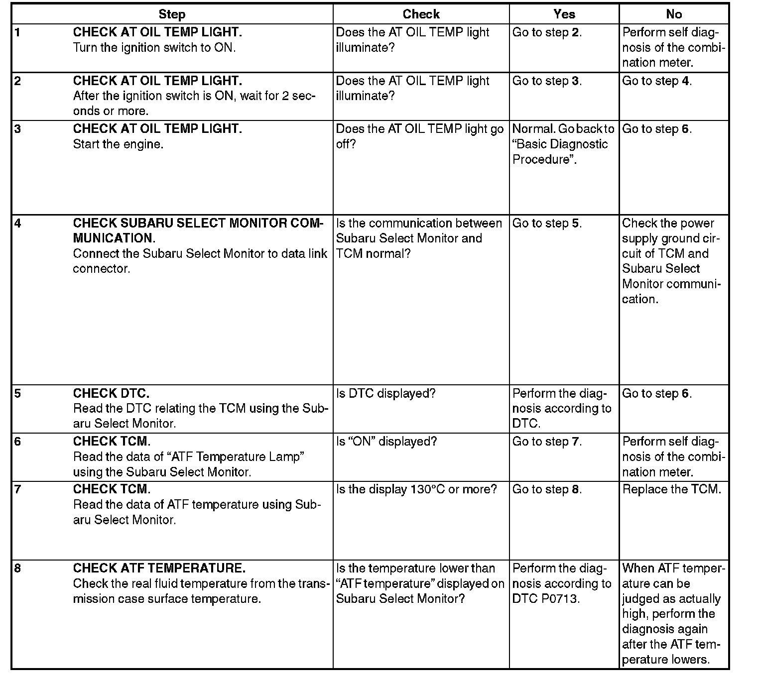 When any on-board diagnostics item is malfunctioning, or the learning has not yet completed, AT OIL TEMP light blinks. Blinking continues from the engine start to the ignition switch OFF. The malfunctioning part or unit can be determined by a DTC. Problems which occurred previously can also be identified through the memory function. If the AT OIL TEMP light does not blink although a problem is occurring, the problem can be determined by checking the performance characteristics of each sensor using the Subaru Select Monitor. If the learning has not yet completed, "AT learning not completed" is displayed when the Subaru Select Monitor is connected while AT OIL TEMP light is blinking. The AT OIL TEMP light blinking will go off, when the learning is performed. Indicator light signal patterns are as shown in the figure.