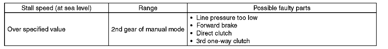 ^ If the stall speed is higher than the specified range, attempt to finish the stall test in as short a time as possible, in order to prevent the automatic transmission from sustaining damage.