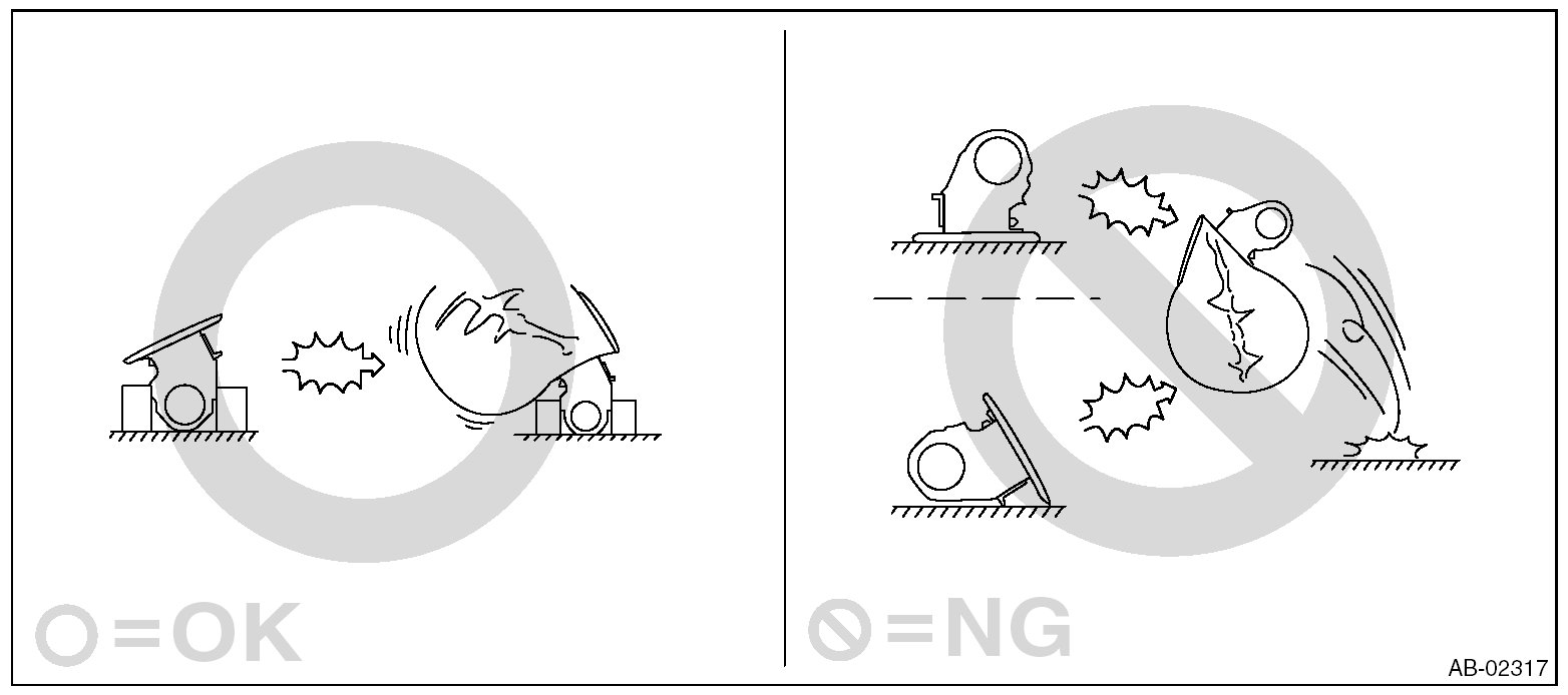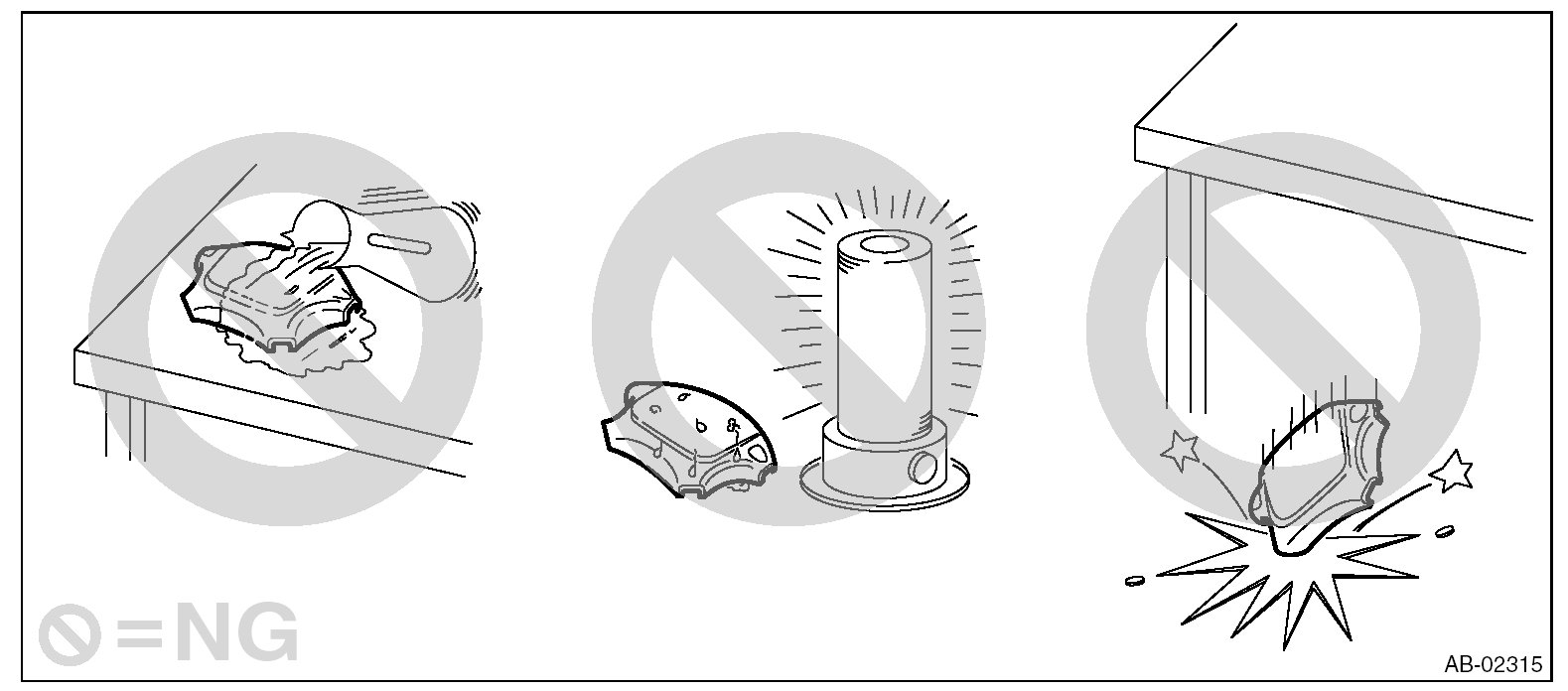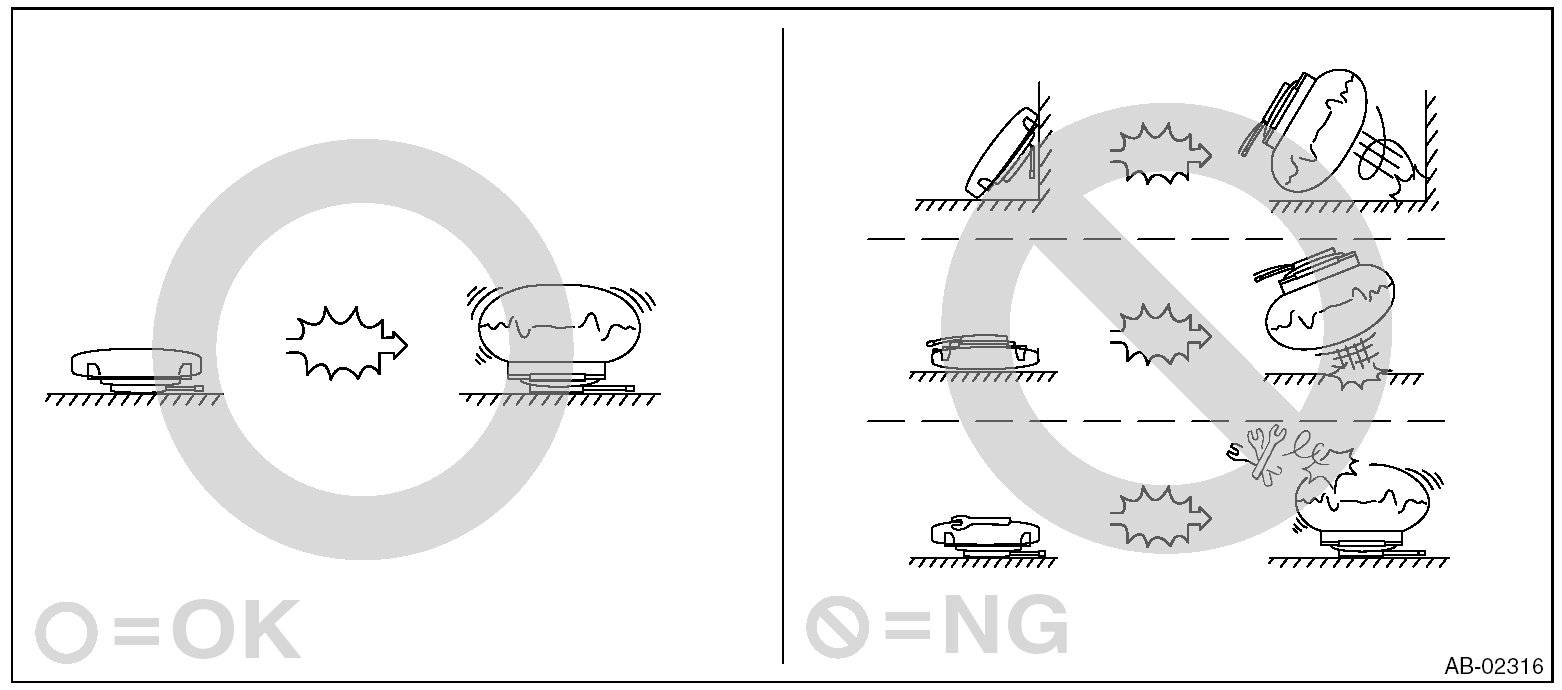 - Do not drop any airbag component, store them under high temperature of 85 °C (185 °F) or more, or let water, oil or grease get on them; the internal parts may be damaged or the reliability may be greatly lowered.