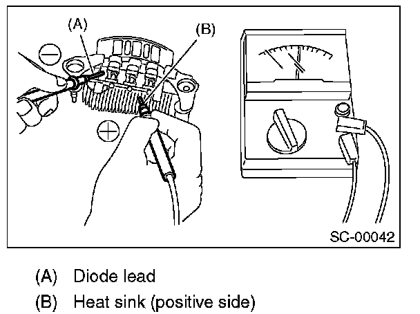 1. Check for continuity between the diode lead and positive side heat sink. If resistance is 1 Ohm or more only in the direction from the diode lead to the heat sink, replace the rectifier.