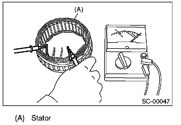 2. Inspect the continuity between the stator coil stator core and lead wire terminals. If the resistance is 1 Ohm or less, replace the stator assembly.