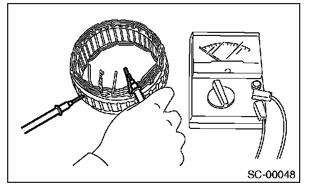 2. Check for continuity between the negative side heat sink and diode lead. If resistance is 1 Ohm or more only in the direction from the heat sink to the diode lead, replace the rectifier.