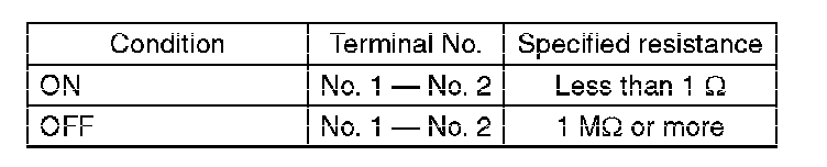 (2) Measure the resistance between terminal 1 and 2 of the switch. If the resistance is not within the specification, check the clutch stroke and installation condition, and check the clutch switch again.