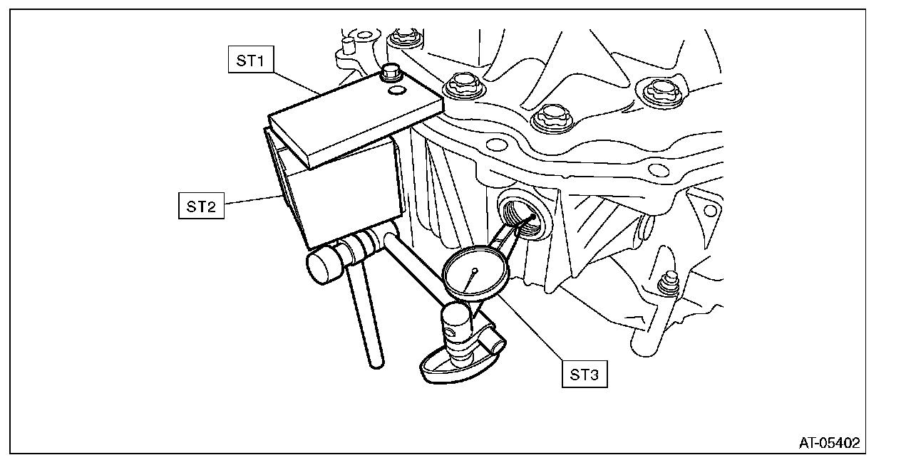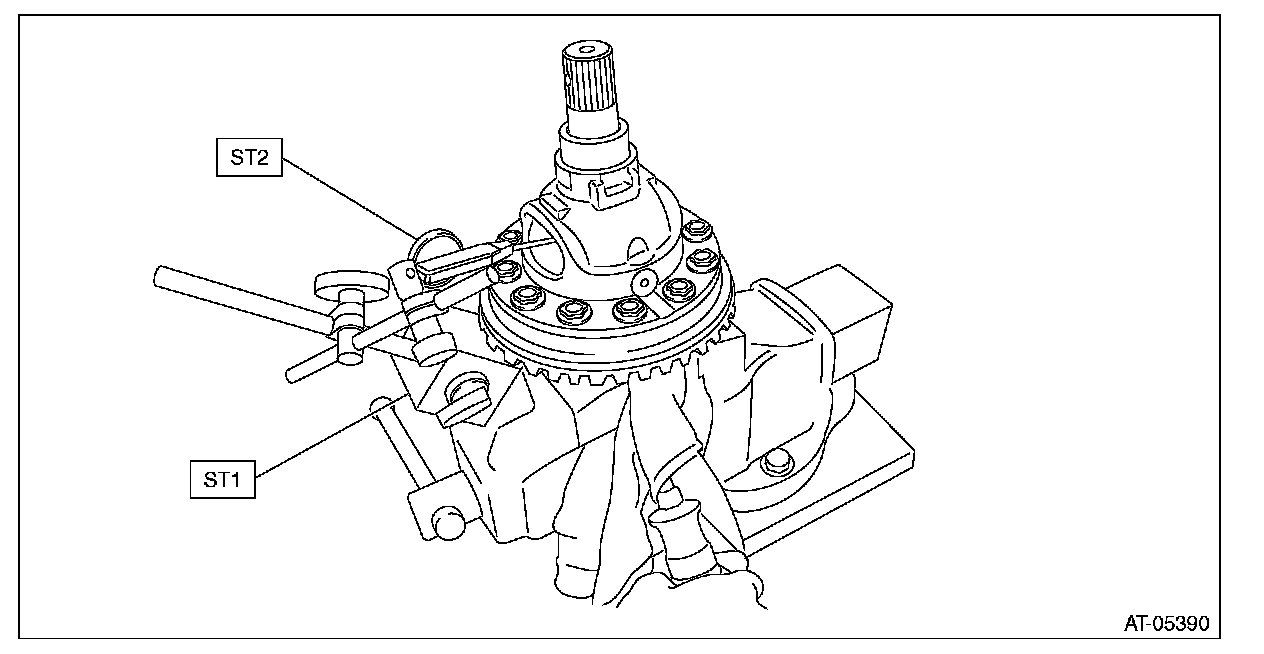 (2) Measure the gear backlash using ST1 and ST2, and then insert the ST2 through the window of differential case.