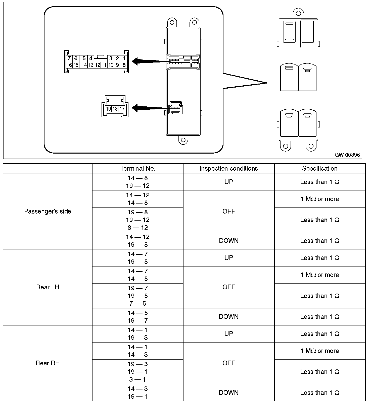 CAUTION: Since the driver's side power window switch is controlled by CPU, do not check continuity for switch alone with the circuit tester. Performing continuity check with circuit tester may damage the driver's side power window switch circuit.