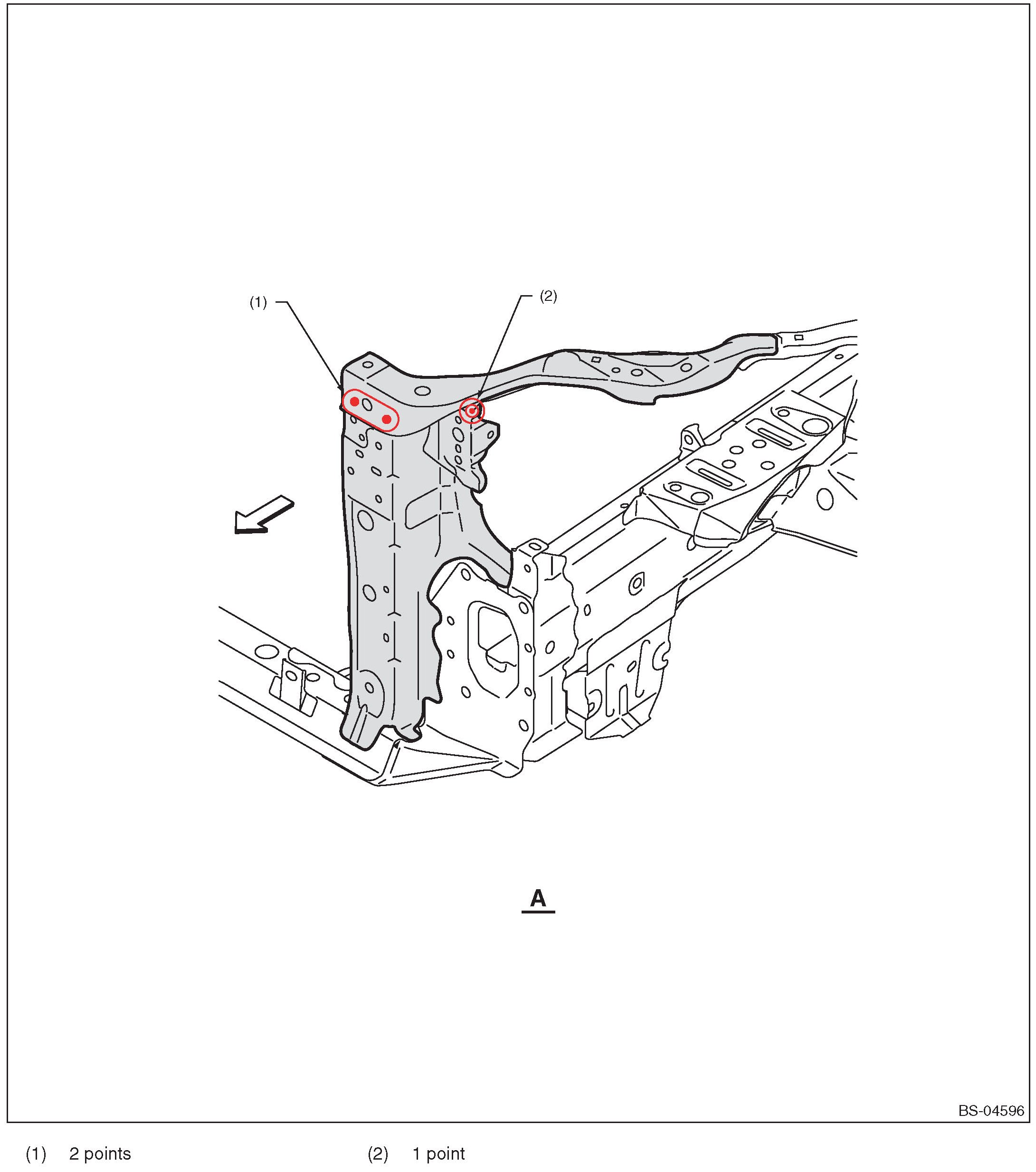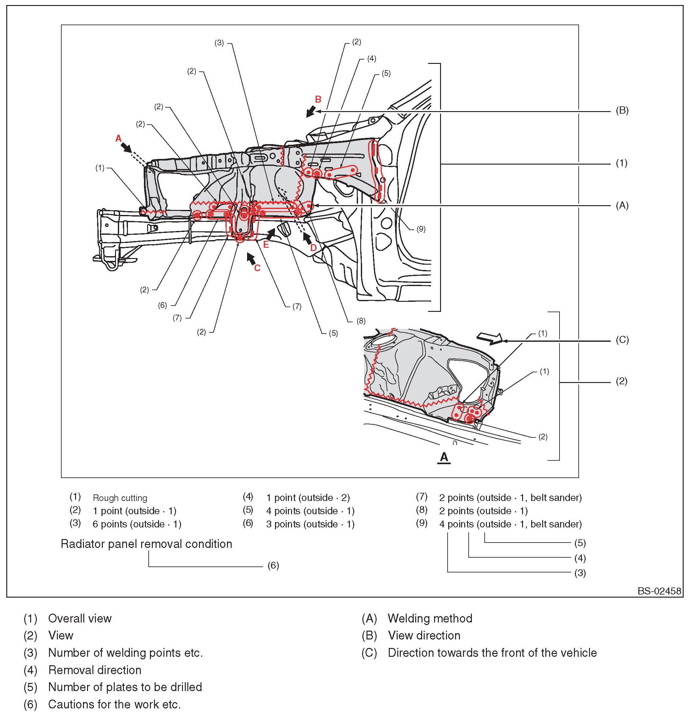 - Symbols and number of points indicate the welding method and the number of welding points. Text in brackets indicates the direction for removal of welded parts, and numbers indicate the number of plates to be drilled in panels of welded parts to be removed.
