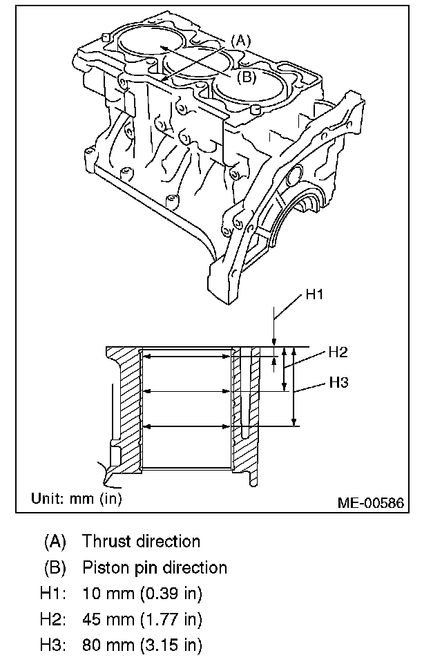 2) Measure inner diameter of each cylinder. Measure the inner diameter of each cylinder in both the thrust and piston pin directions at the heights as shown in the figure, using a cylinder bore gauge.