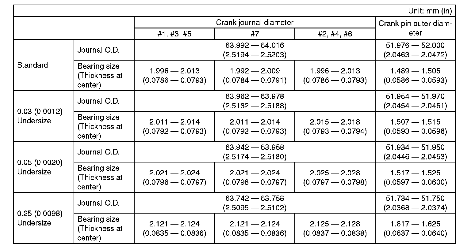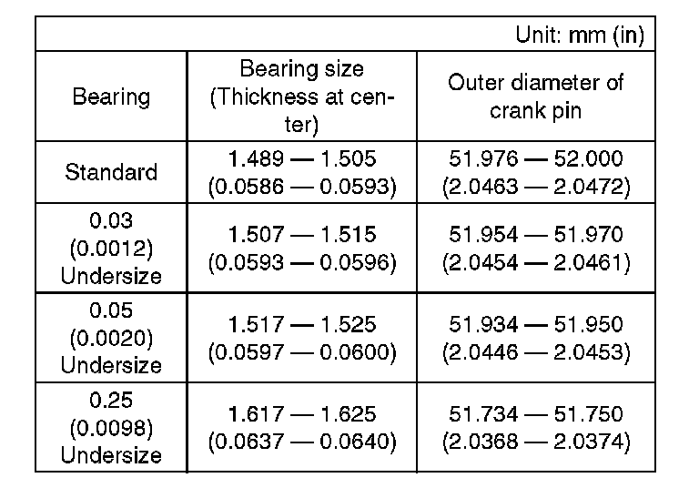 3) Inspect the crank journal and crank pin for wear. If they are not within the standard, replace the bearing with a suitable (undersize) one, and replace or grind to correct the crankshaft as necessary. When grinding the crank journal or crank pin, finish them to the specified dimensions according to the undersize bearing to be used.
