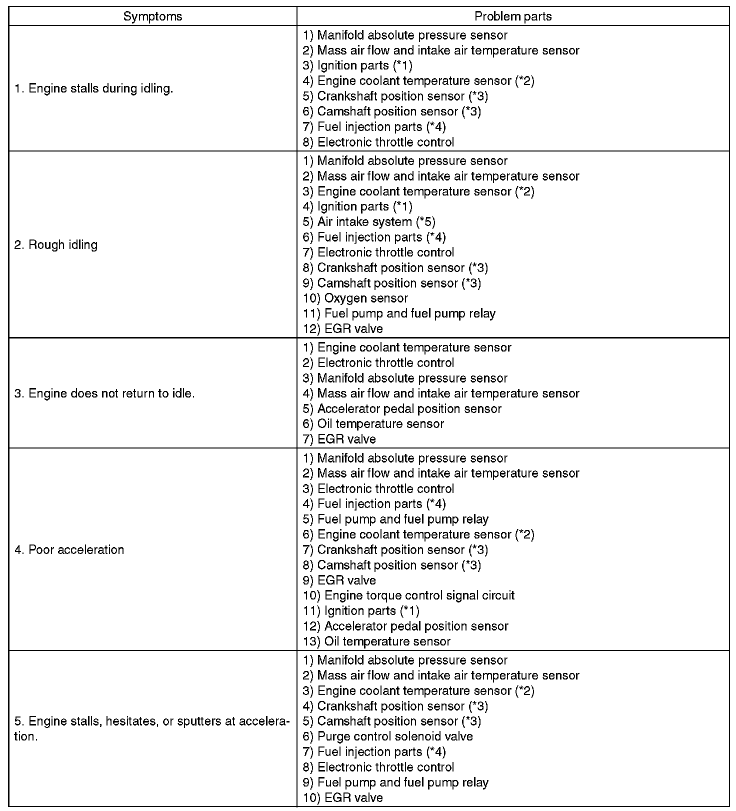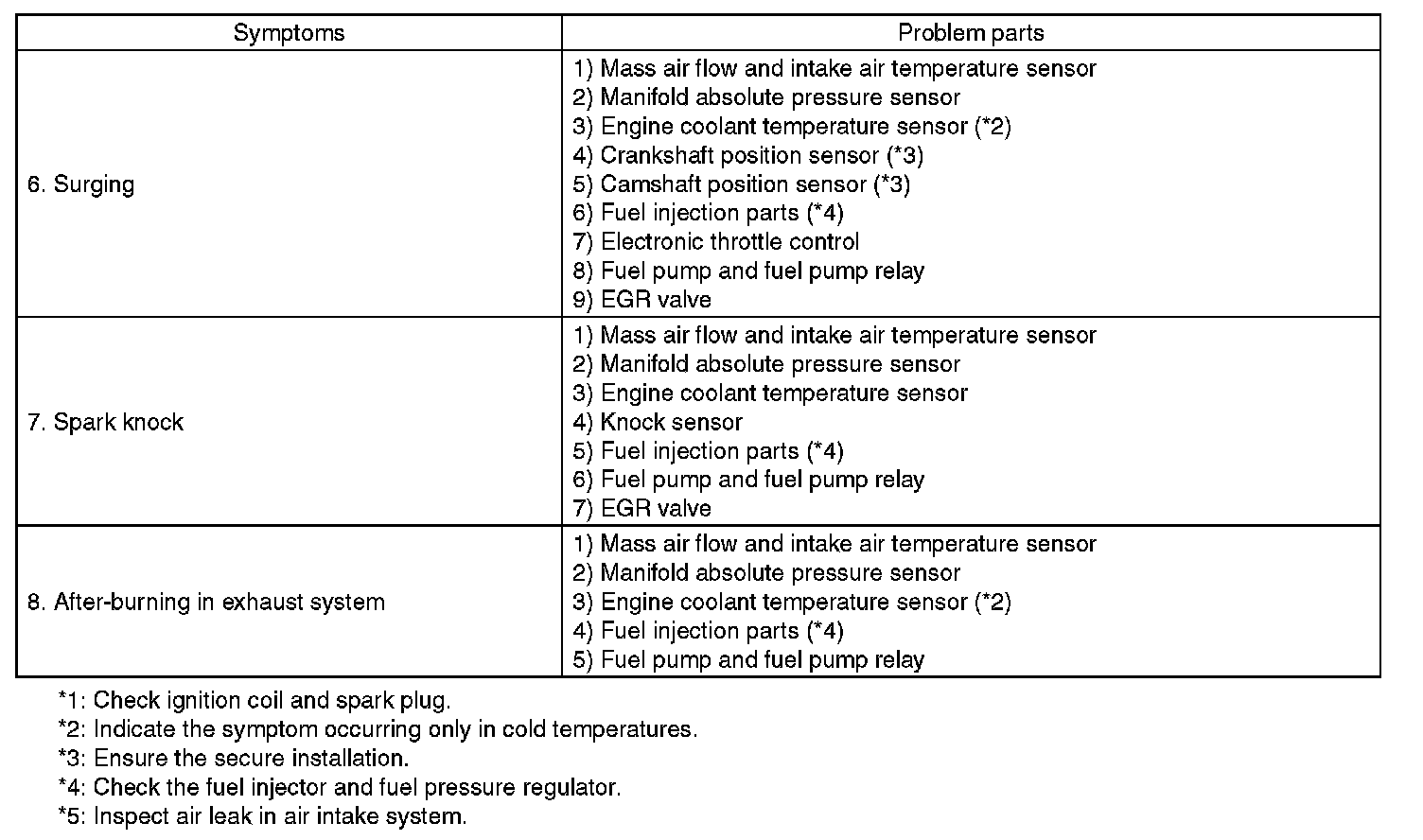 Malfunction of parts other than those listed is also possible.
