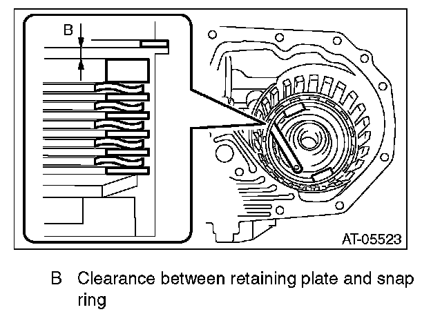 (2) Measure the clearance "B" between the retaining plate and snap ring using a thickness gauge.