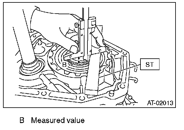 2) Using the ST, measure the depth "B" from the convex surface of oil pump cover to thrust bearing transferring surface.