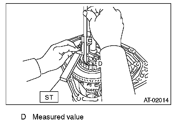 4) Using the ST, measure the depth "D" from the AT main case mating surface to thrust bearing transferring surface of front sun gear.
