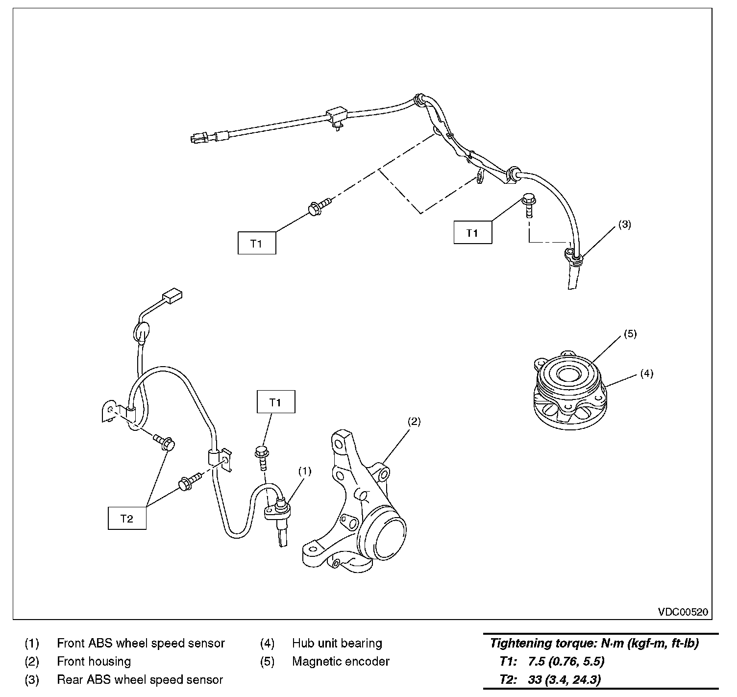 1) Check the tip of the ABS wheel speed sensor for foreign particles or damage. If necessary, clean the tip or replace the ABS wheel speed sensor.
