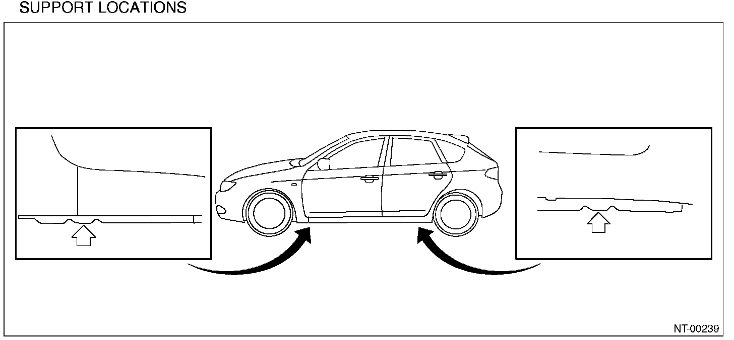 - Do not use the plate lift whose attachment does not reach the supporting locations. The figure of vehicle indicates the supporting locations, supporting procedures, etc. for 5 door model, and they are same for 4 door model.