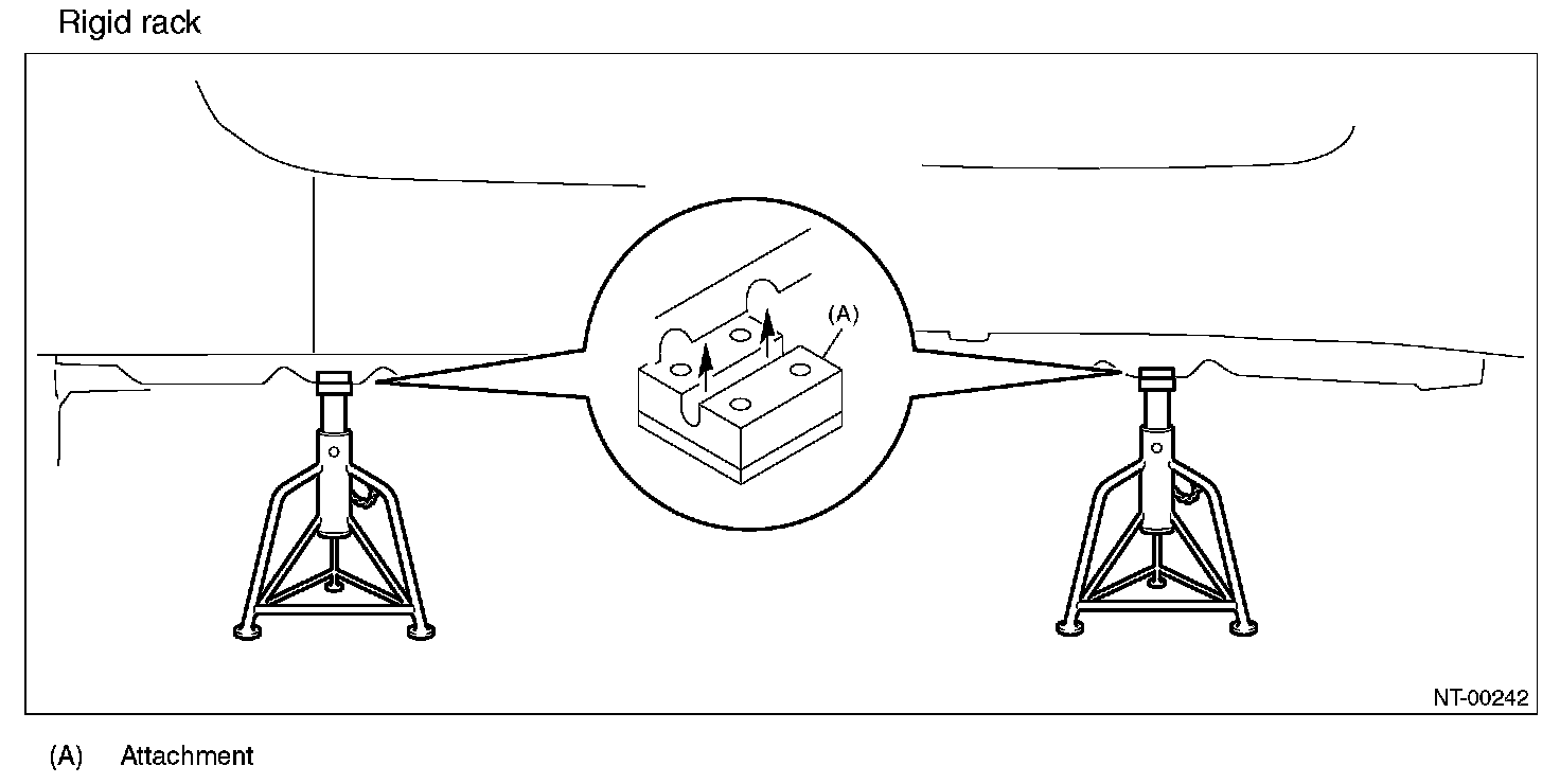 When using a lift or shop jack to raise a vehicle or using rigid rack to support a vehicle, always follow instructions concerning jack-up points and weight limits to prevent the vehicle from falling, which could result in injury. Be especially careful that the vehicle is balanced before raising it. Be sure to set the wheel stoppers when jacking-up only the front or rear side of the vehicle.