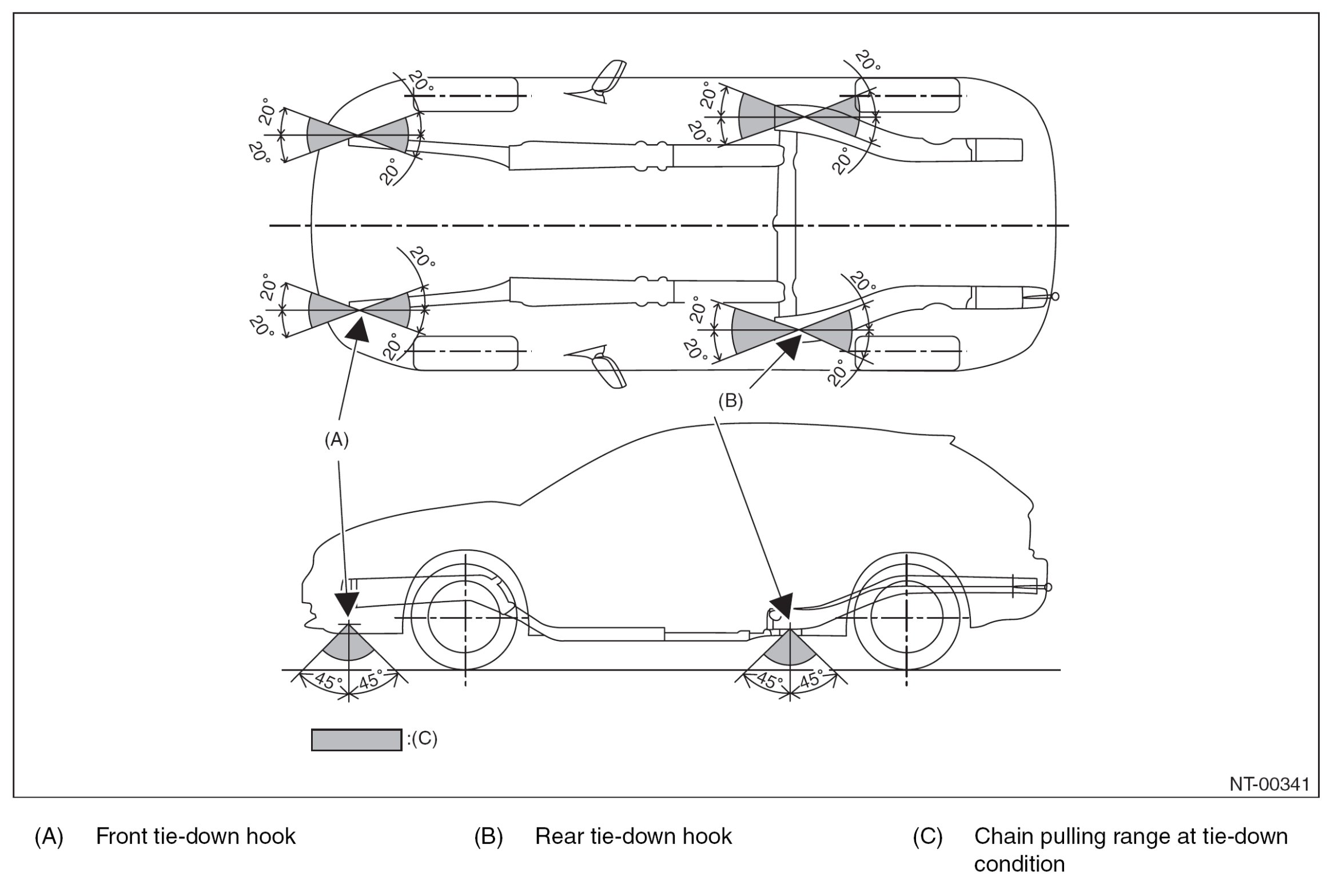 CAUTION: When the vehicle is tied down from vehicle inside, hook the hooks of tie-down chain on the rear tiedown hooks from vehicle inside. When the vehicle is tied down from vehicle outside, hook the hooks of tie-down chain on the rear tie-down hooks from vehicle outside.