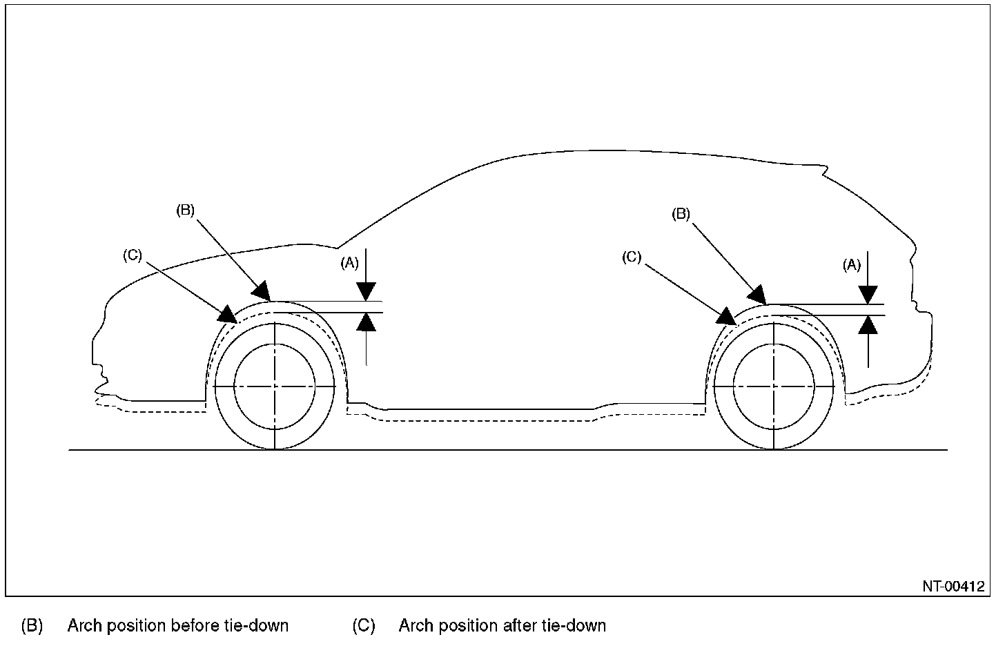 2. After tie-down, measure the distance between the highest tire point and highest arch point at the center of wheel.