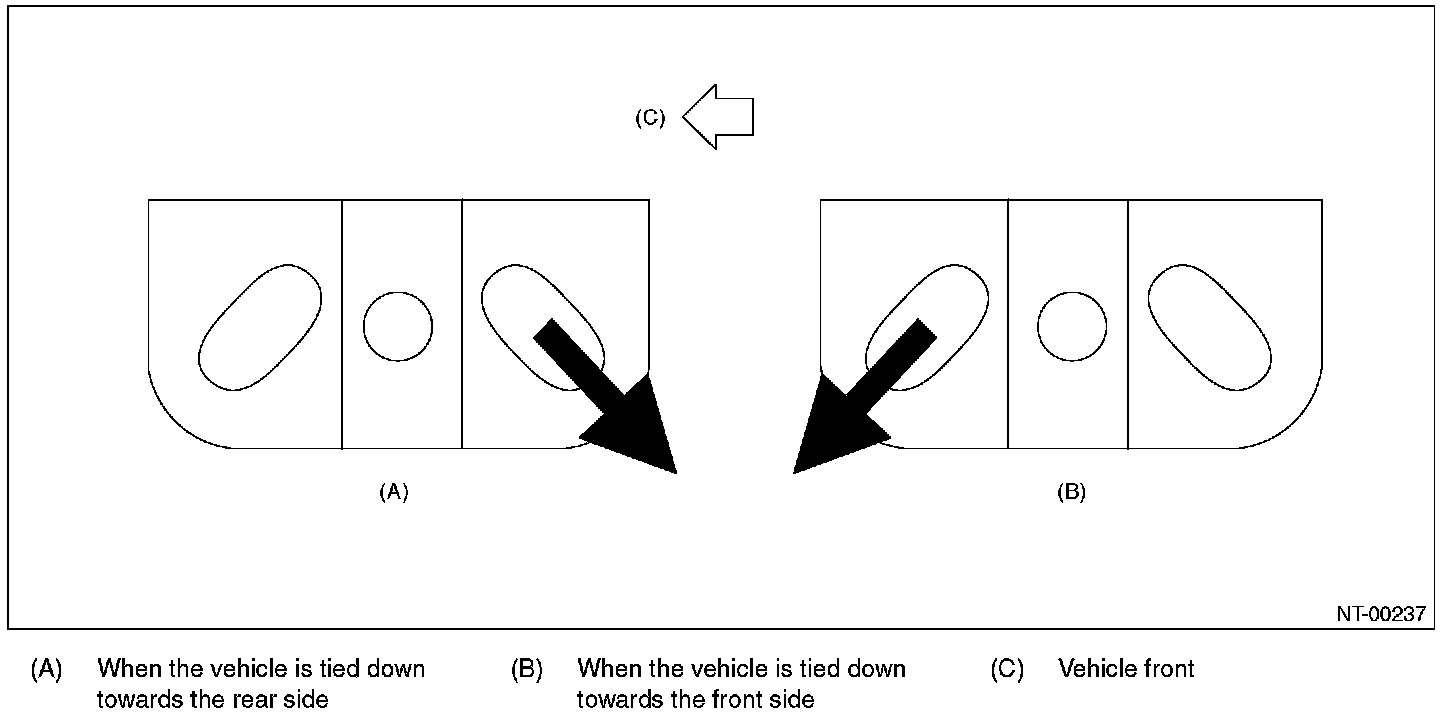 When the vehicle is tied down from the rear side, use the holes at the rear side, and when the vehicle is tied down from the front side, use the holes at the front side.