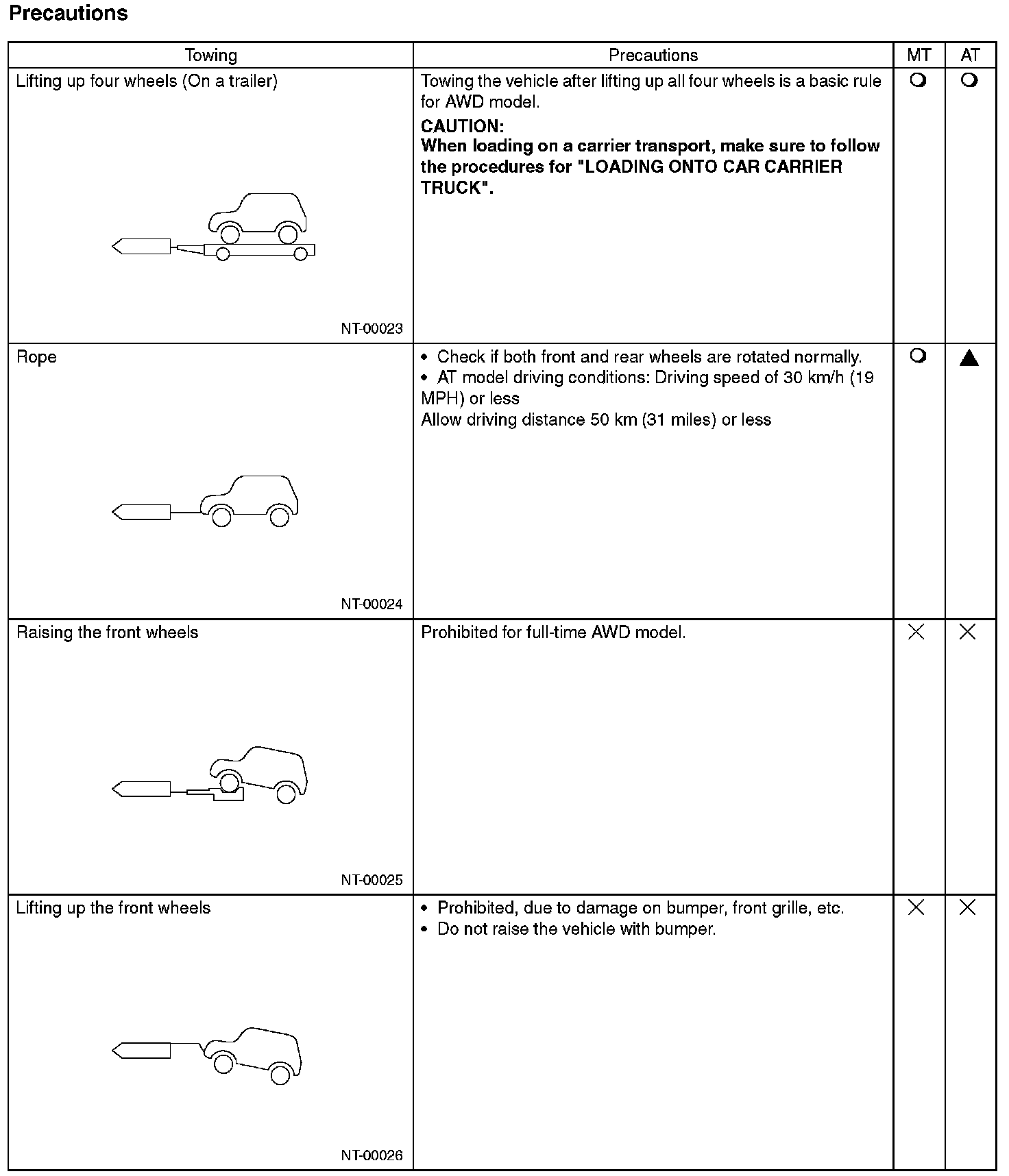 Avoid towing vehicles except when the vehicle cannot be driven. For models with AWD and AT, use a car carrier truck instead of towing. When towing other vehicles, pay attention to the following to prevent hook or vehicle damage resulting from excessive weight.