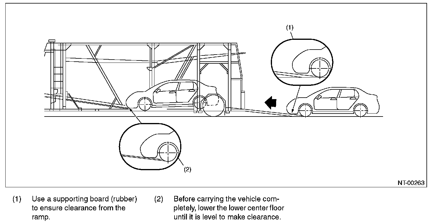- When carrying the vehicle onto a car carrier truck, perform the operation being careful with the gap between the height of the carrier's floor and the vehicle lower side because of little clearance under the front bumper.