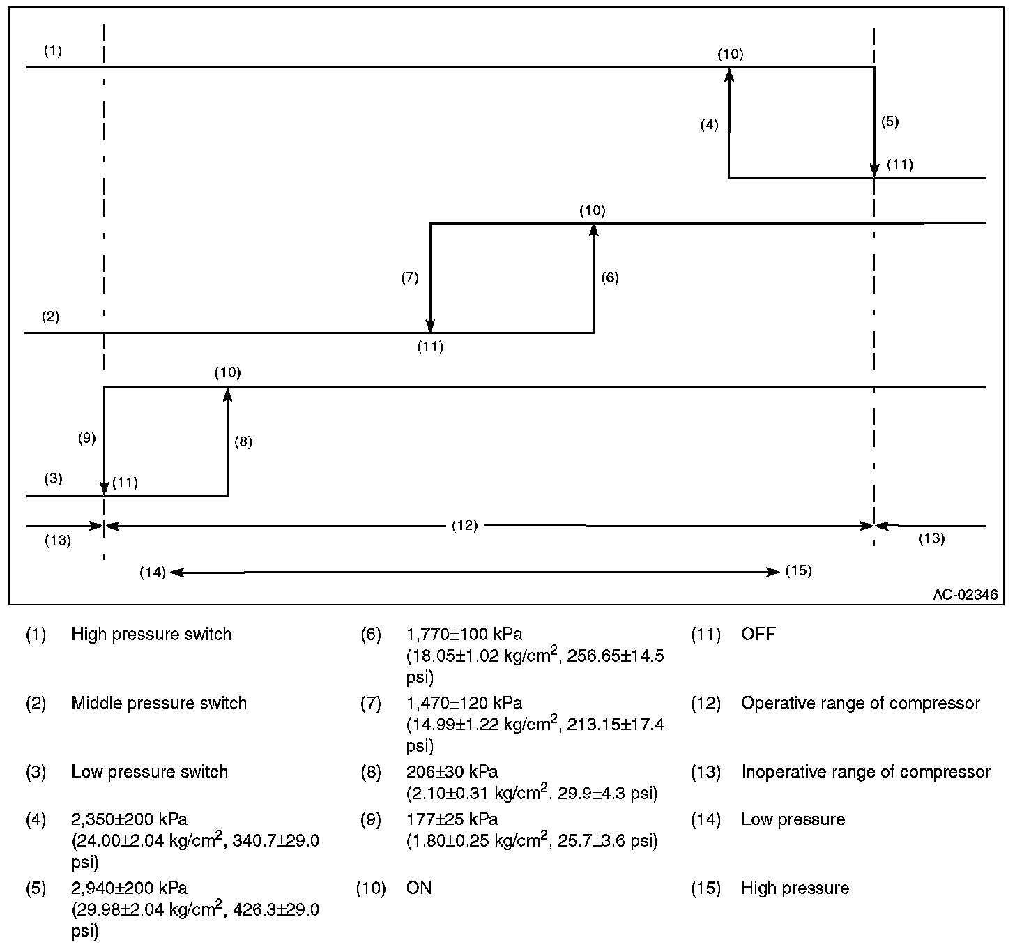 3. Start the air conditioner, and check the operating pressure of switch by turning the compressor (magnet clutch) to ON/OFF. Operation of each switch is as follows.