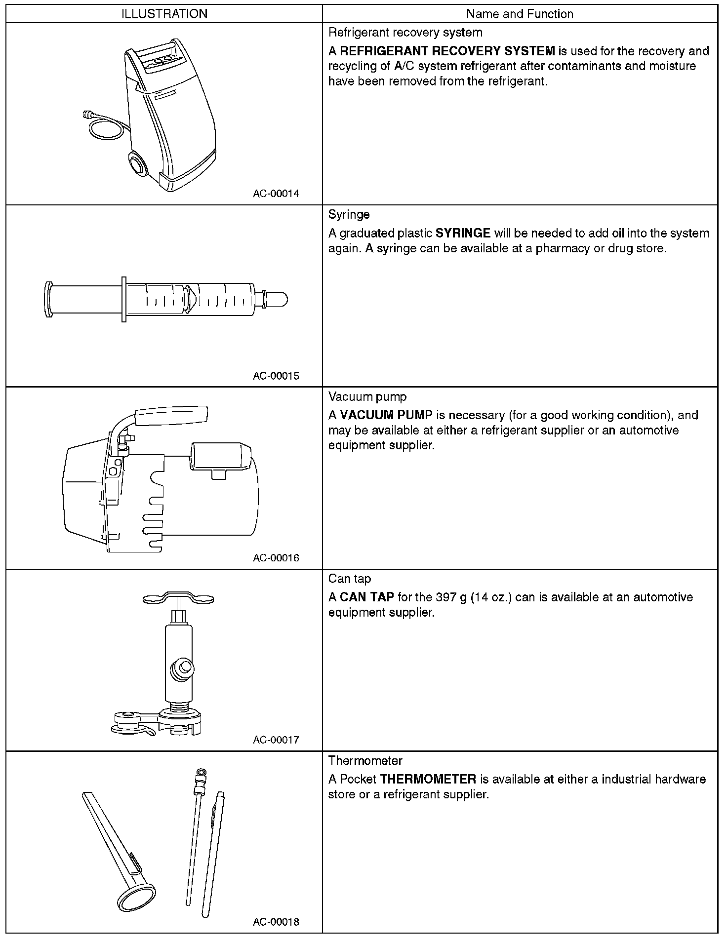 When working on vehicles with a HFC-134a system, only use HFC-134a specified tools and parts. Do not mix CFC-12 tools and parts. If HFC-134a and CFC-12 refrigerant or compressor oil is mixed, it will result in poor lubrication and the compressor itself may be damaged.