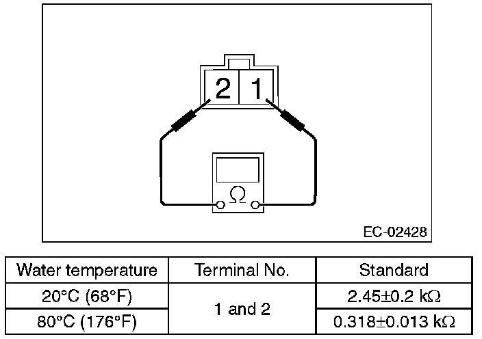 3. Raise water temperature gradually, measure the resistance between the engine coolant temperature sensor terminals when the temperature is 20°C (68° F) and 80° C (176° F).