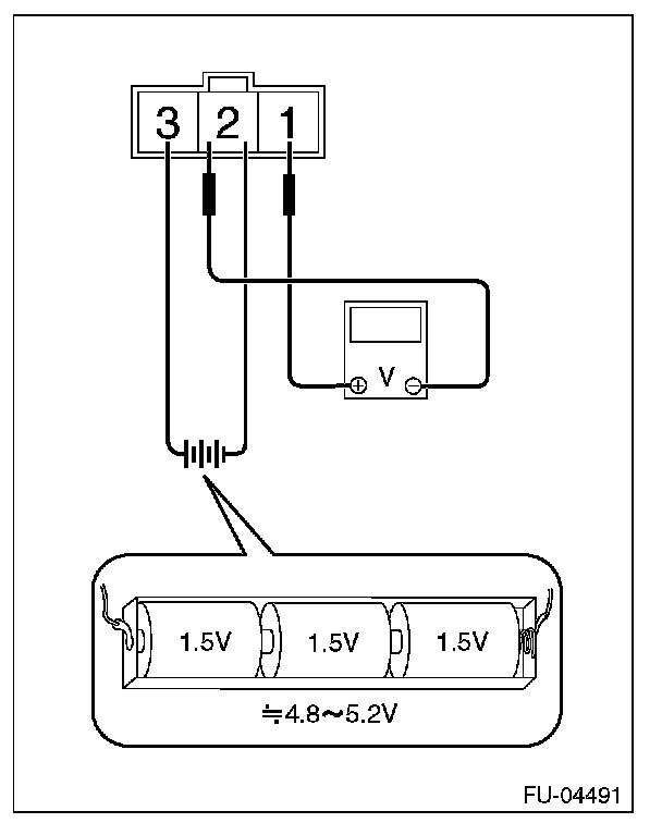 2. Connect dry-cell battery positive terminal to terminal No. 3 and dry-cell battery ground terminal to terminal No. 2, circuit tester positive terminal to terminal No. 1 and the circuit tester negative terminal to terminal No. 2.