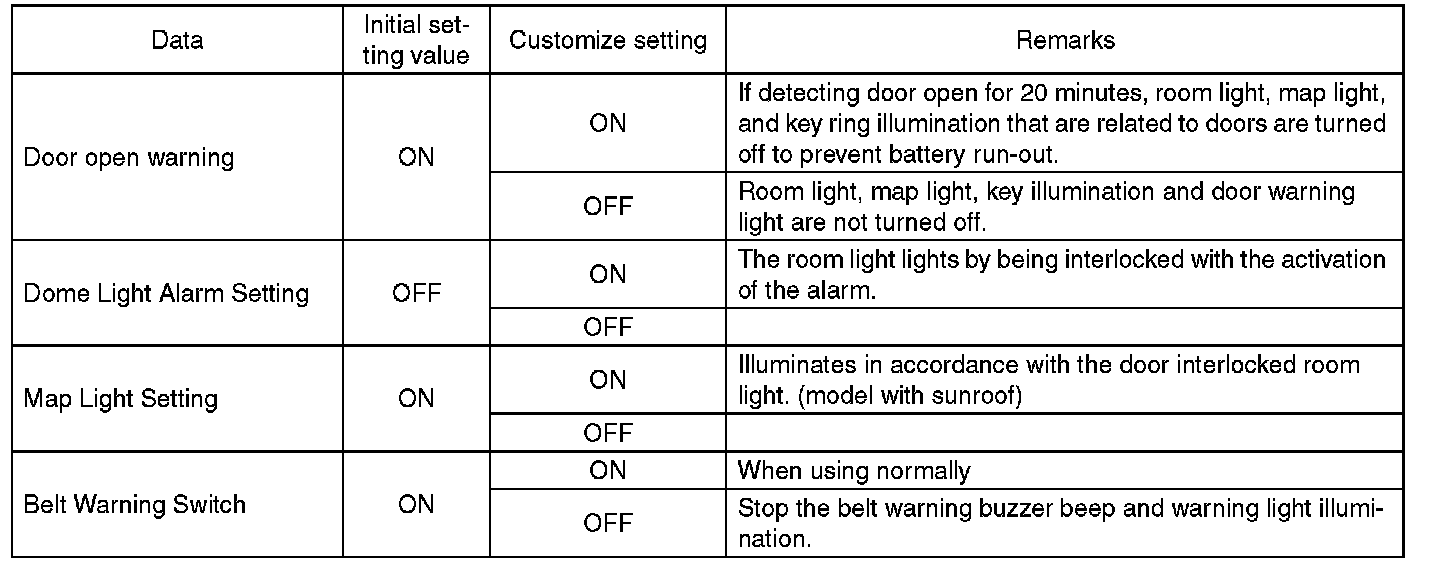 - Each settings have been set. It can be recognized by key ring illumination coming on in concocting with room light and going off with ignition switch turned to ON.